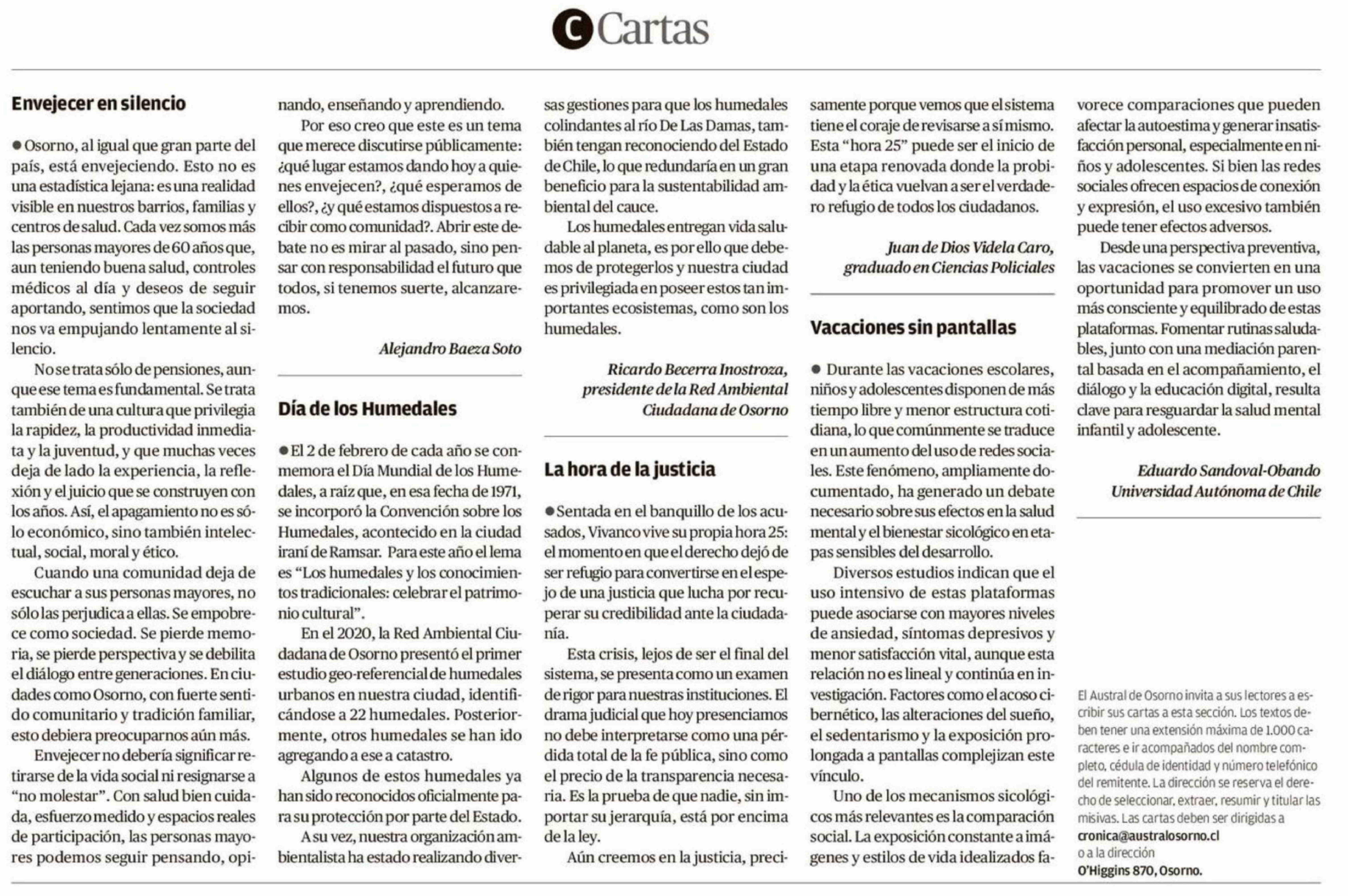 | Título: | Cartas: · Osorno, al igual que gran parte del país, está envejeciendo. Esto no es una estadística lejana: es una realidad visible en nuestros barrios, familias y centros de salud. Cada vez somos más las personas mayores de 60 años que, aun teniendo buena salud, controles médicos al día y deseos de s |