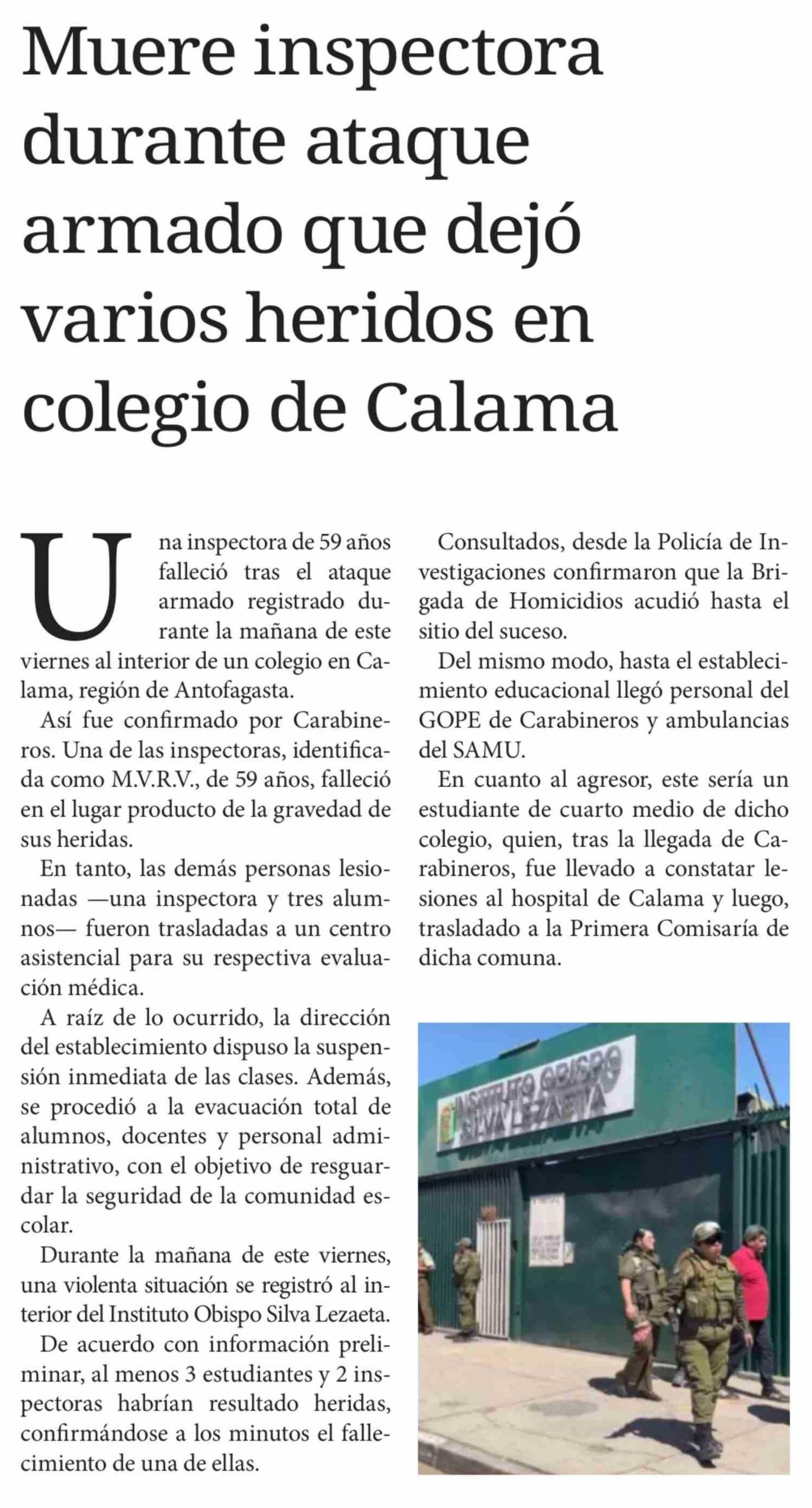 Muere inspectora durante ataque armado que dejó varios heridos en colegio de Calama