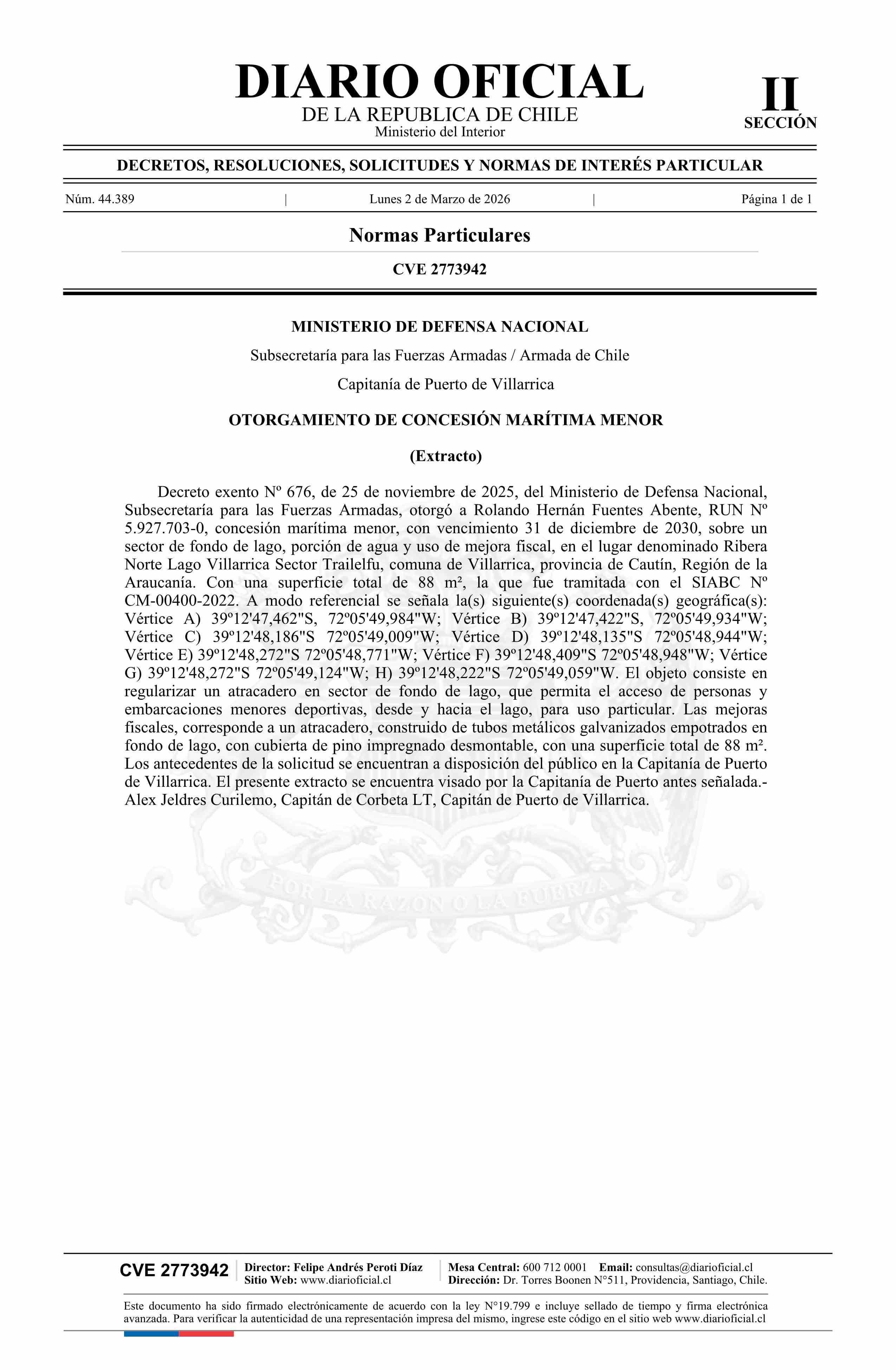 | Título: | Extracto de decreto exento número 676, de 2025.- Otorgamiento de concesión marítima menor |