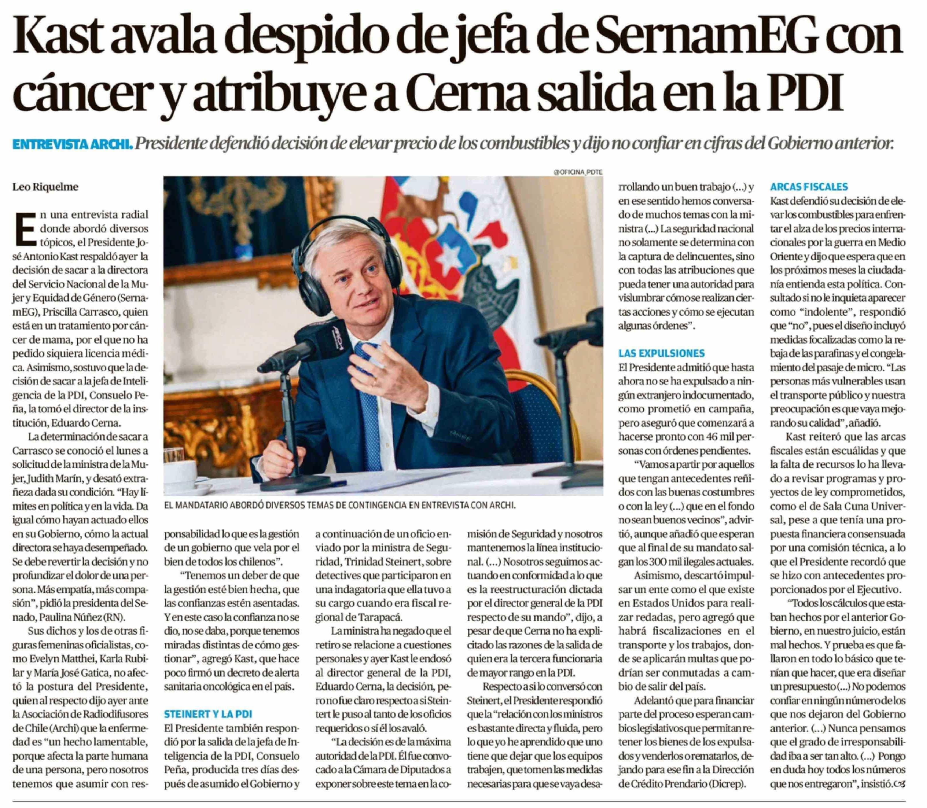 Kast avala despido de jefa de SernamEG con cáncer y atribuye a Cerna salida en la PDI