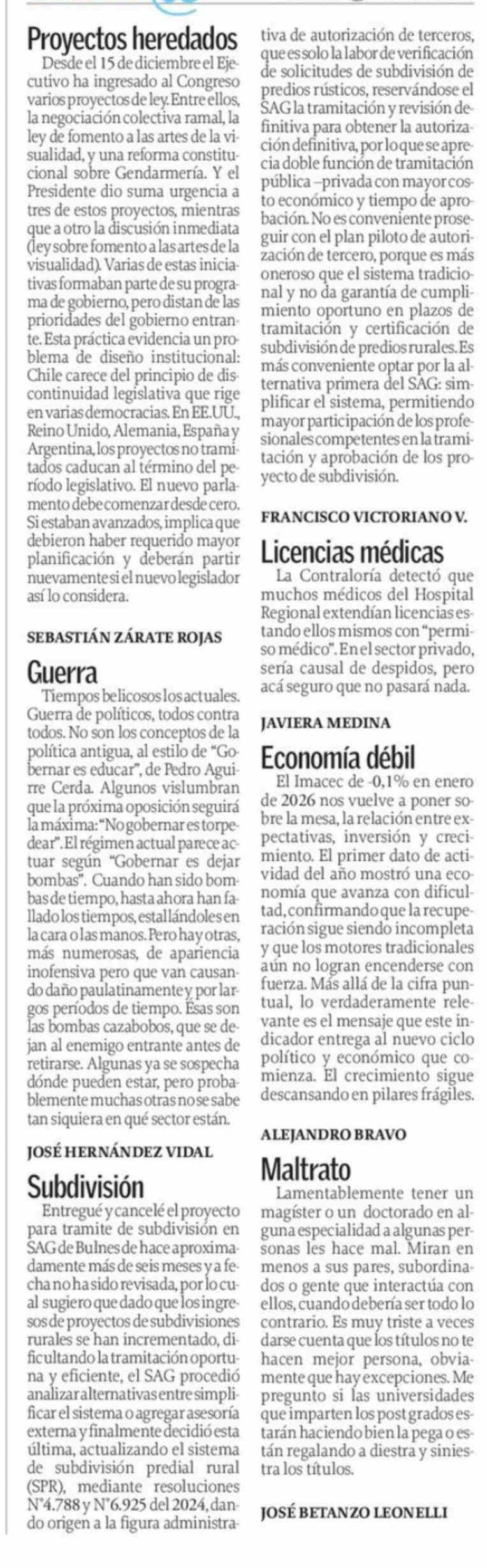Cartas: Proyectos heredados Desde el 15 de diciembre el Eje-