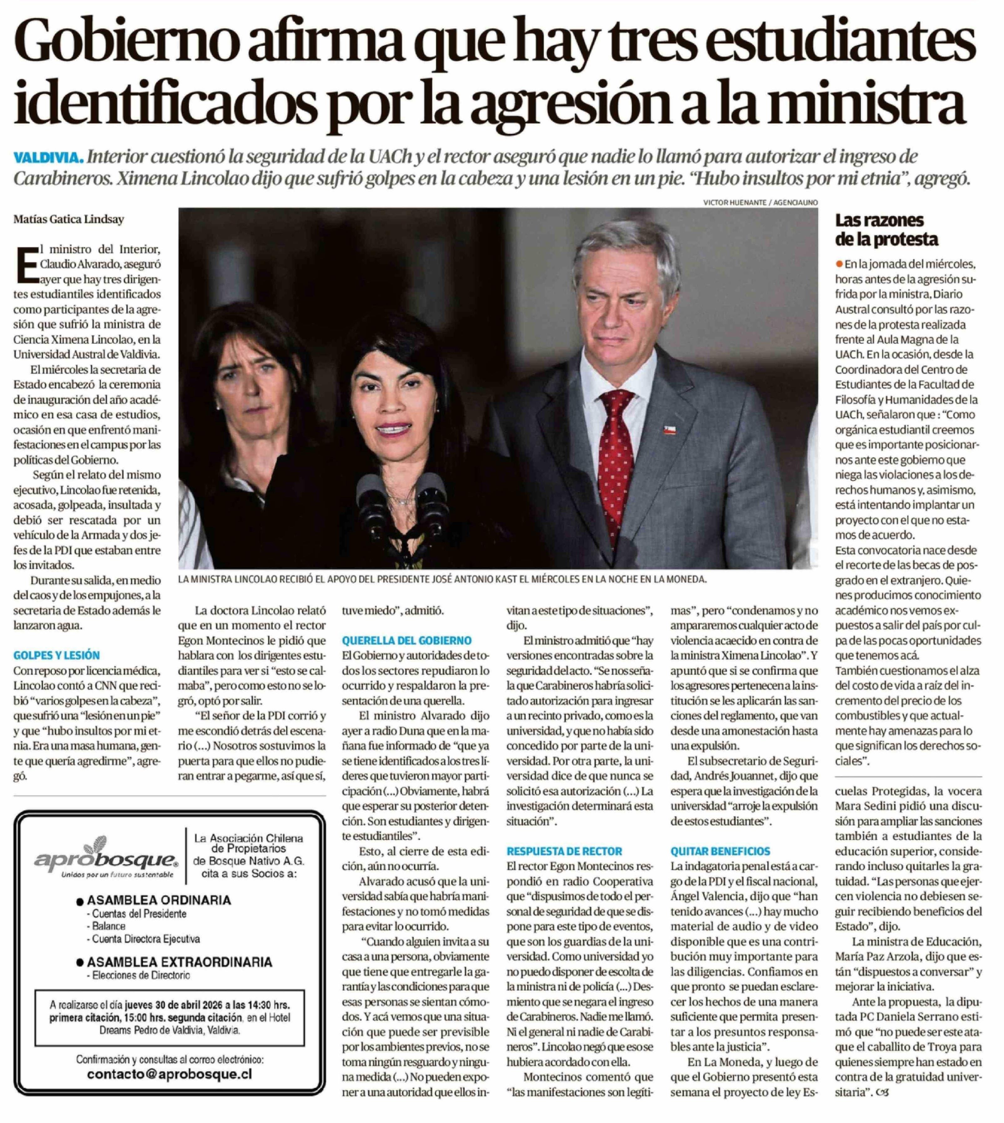 Gobierno afirma que hay tres estudiantes identificados por la agresión a la ministra