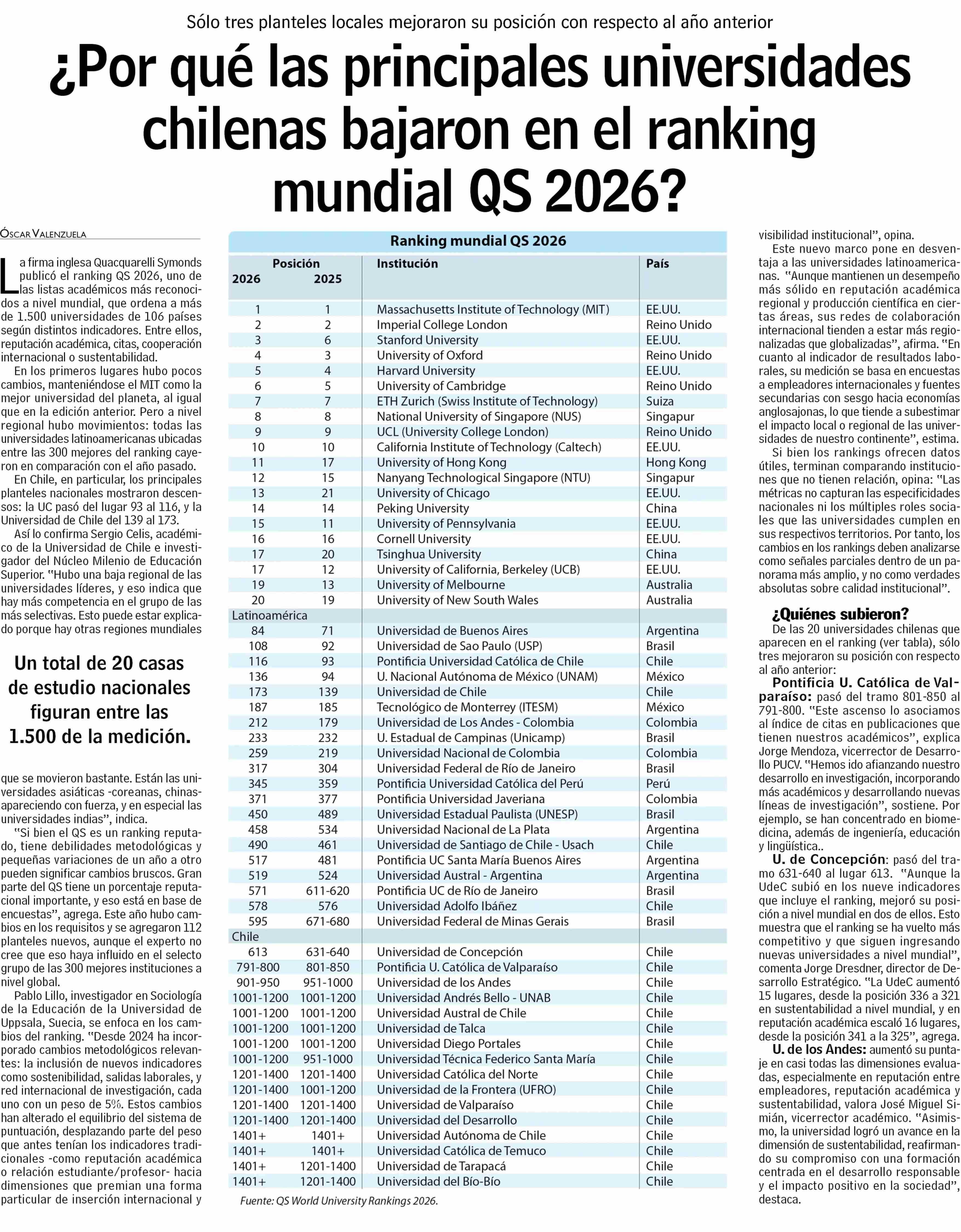 ¿Por qué las principales universidades chilenas bajaron en el ranking mundial QS 2026?