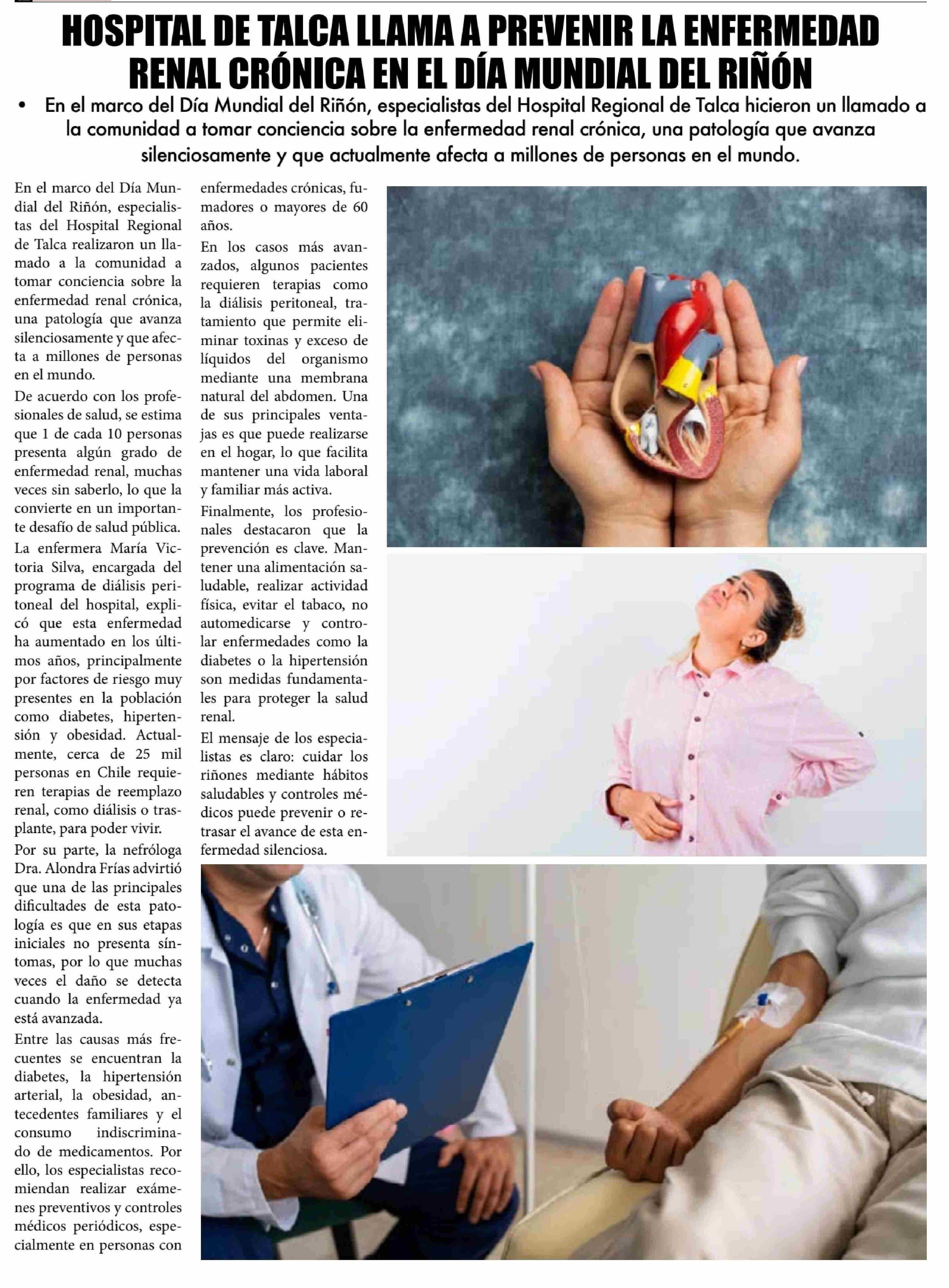 HOSPITAL DE TALCA LLAMA A PREVENIR LA ENFERMEDAD RENAL CRÓNICA EN EL DÍA MUNDIAL DEL RIÑÓN