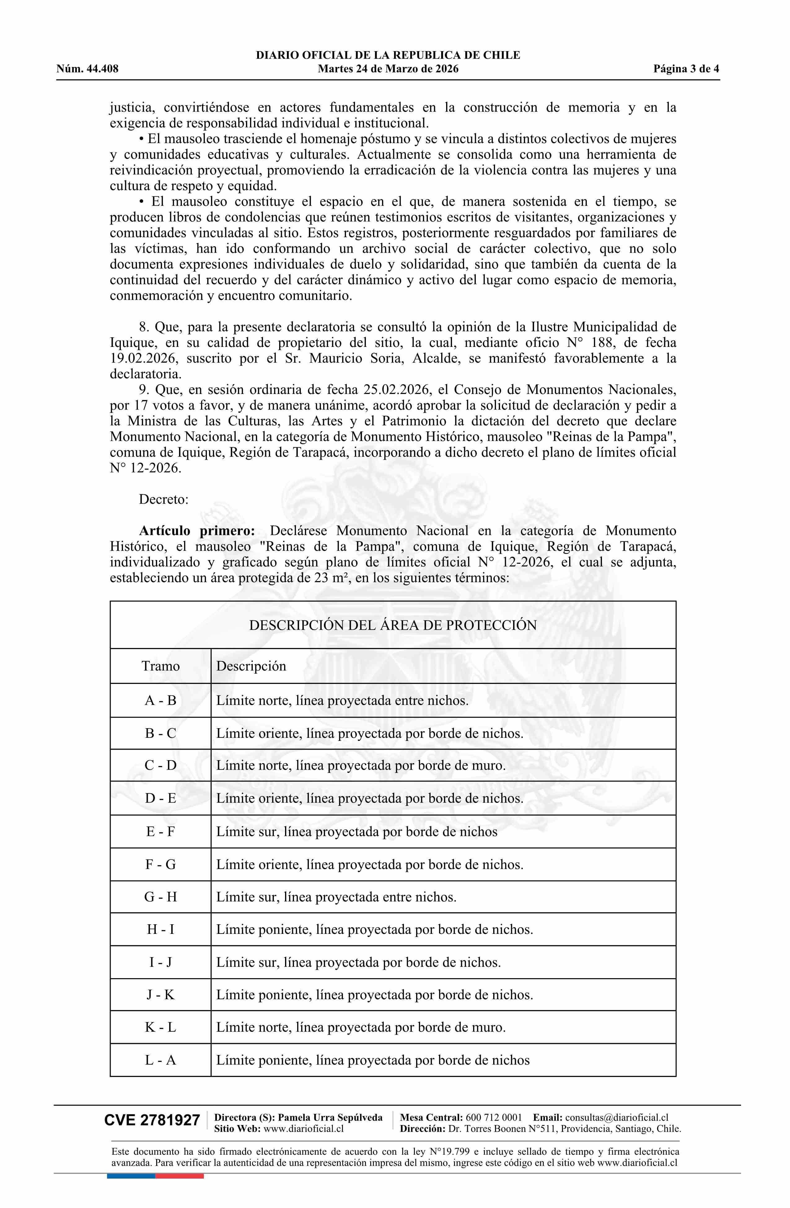 | Título: | Decreto exento número 48, de 2026.- Declara Monumento Nacional, en la categoría de Monumento Histórico, el mausoleo Reinas de la Pampa, comuna de Iquique, Región de Tarapacá |