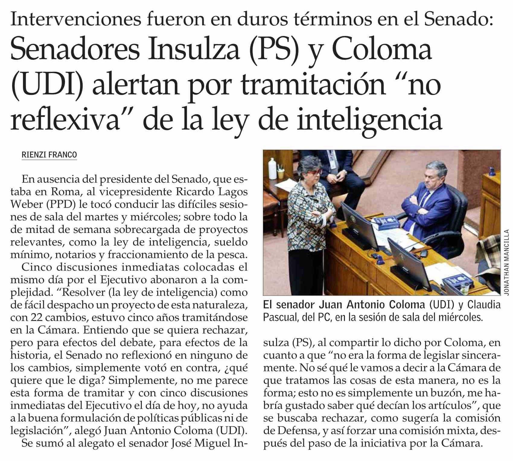 Senadores Insulza (PS) y Coloma (UDI) alertan por tramitación “no reflexiva” de la ley de inteligencia