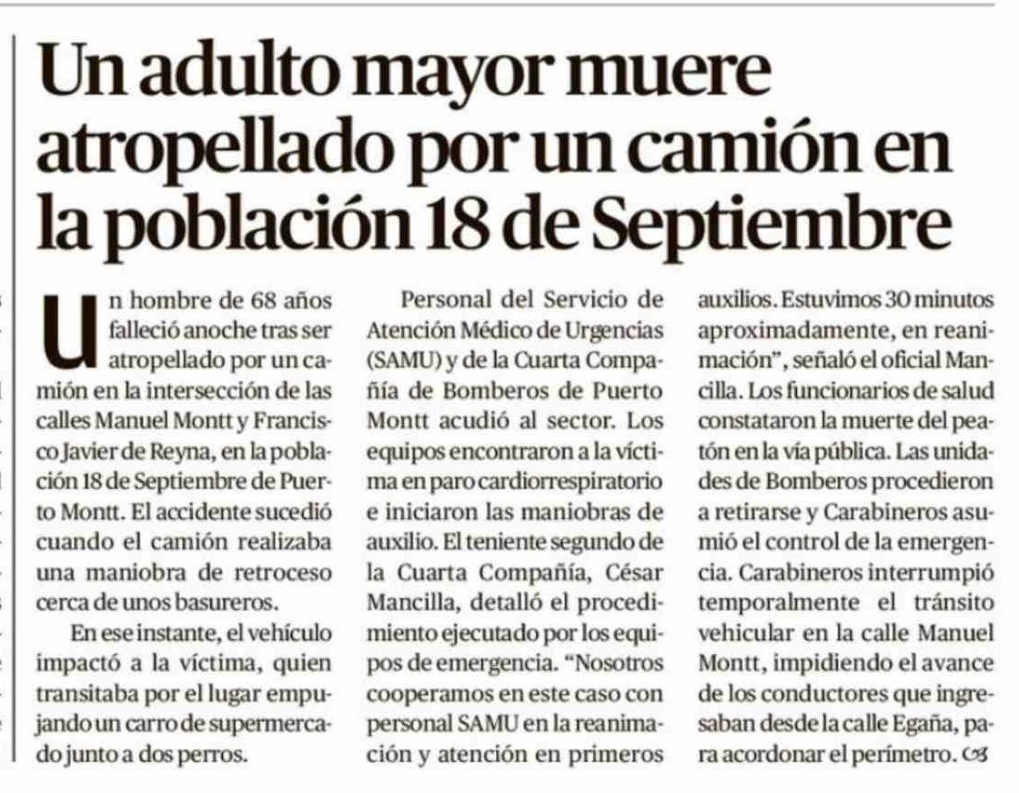 Un adulto mayor muere atropellado por un camión en la población 18 de Septiembre