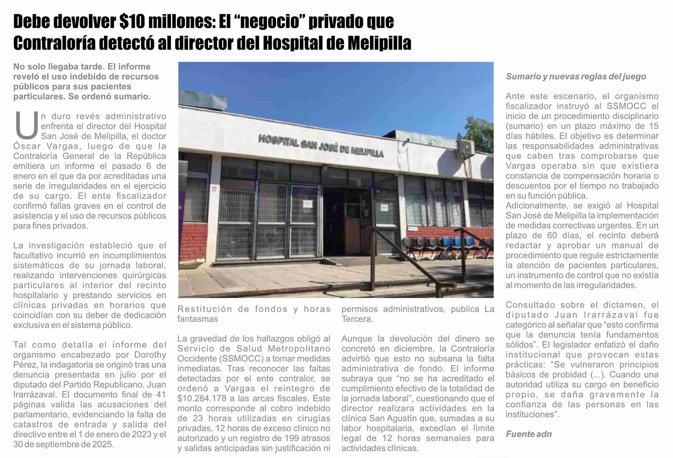 Debe devolver $10 millones: El “negocio” privado que Contraloría detectó al director del Hospital de Melipilla