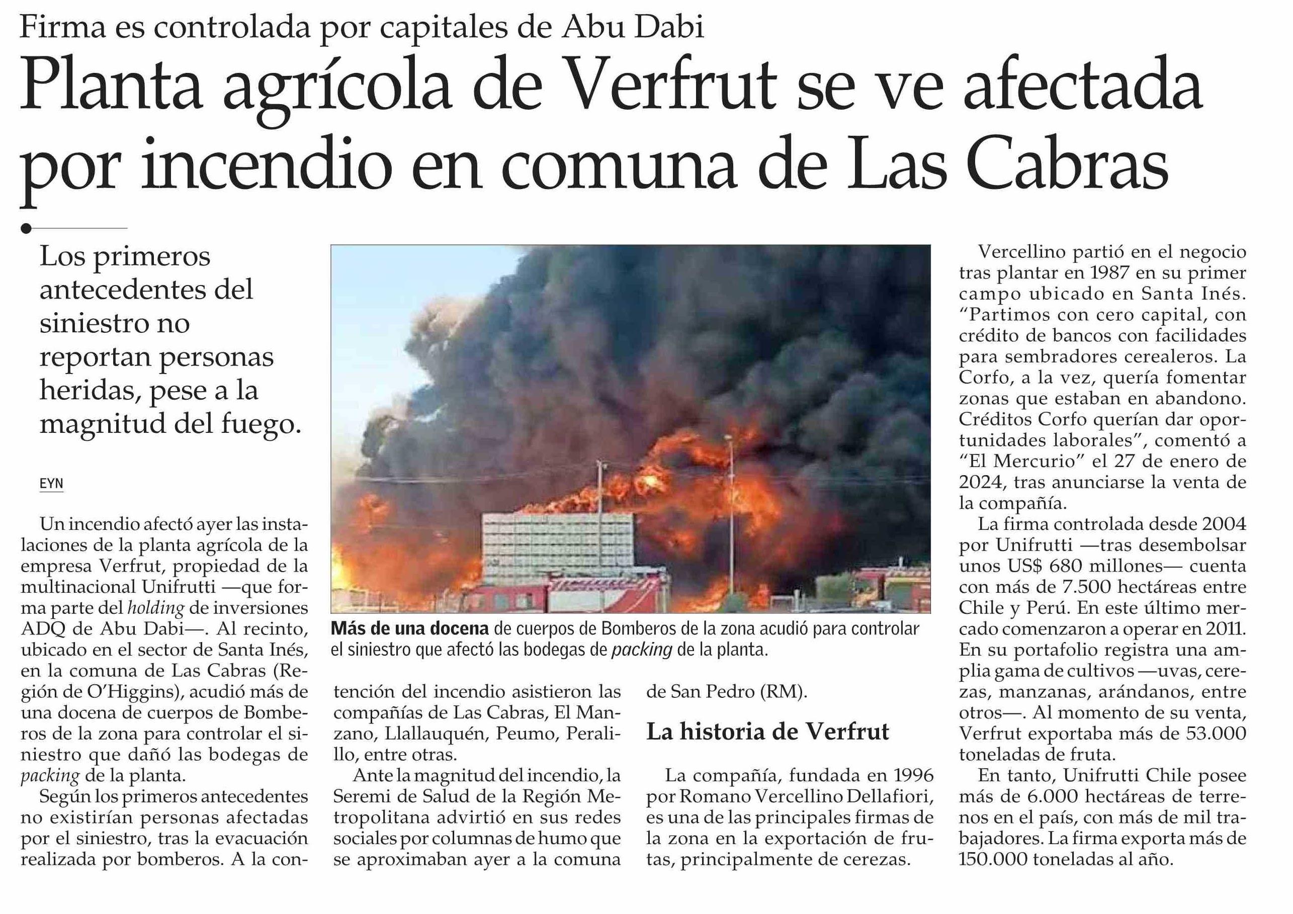 Planta agrícola de Verfrut se ve afectada por incendio en comuna de Las Cabras
