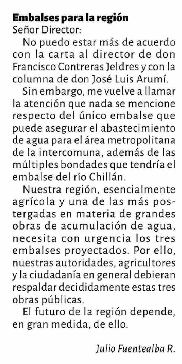 | Título: | Cartas: Embalses para la región Señor Director: No puedo estar más de acuerdo con la carta al director de don Francisco Contreras Jeldres y con la columna de don José Luis Arumí. Sin embargo, me vuelve a llamar la atención que nada se mencione respecto del único embalse que puede asegurar el abastec |