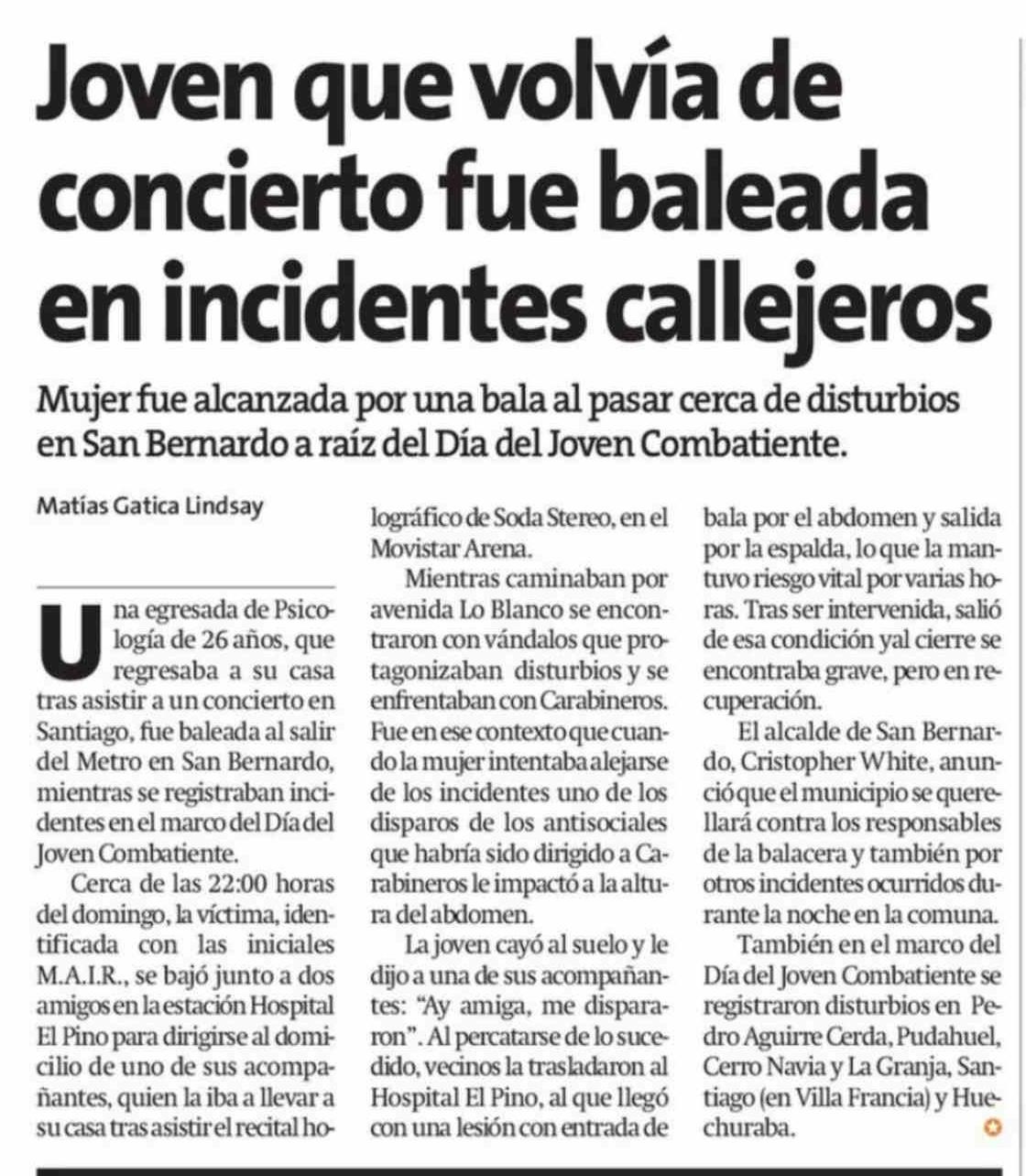 Joven que volvía de concierto fue baleada en incidentes callejeros