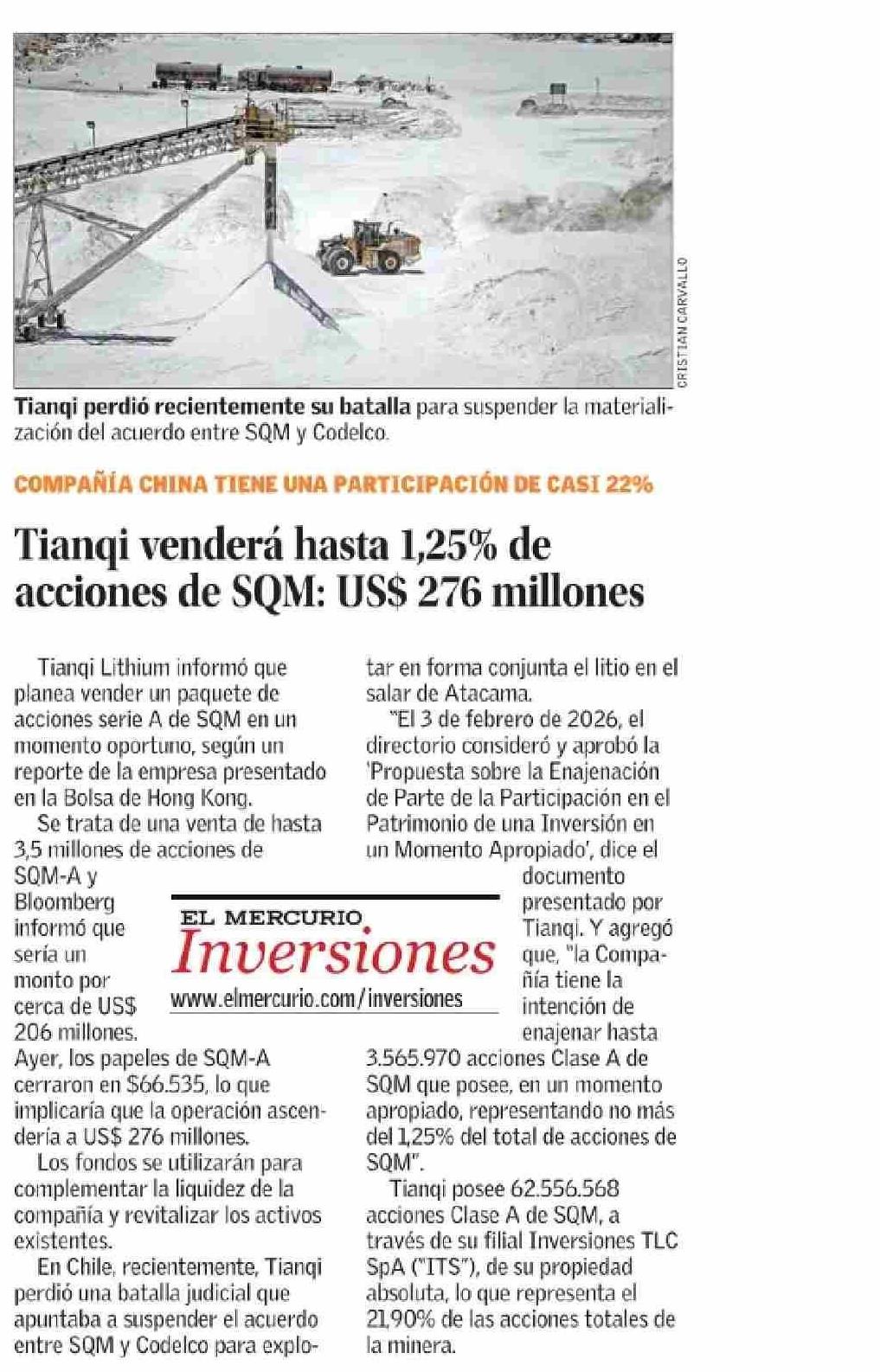 Tianqi venderá hasta 1,25% de acciones de SQM: US$ 276 millones