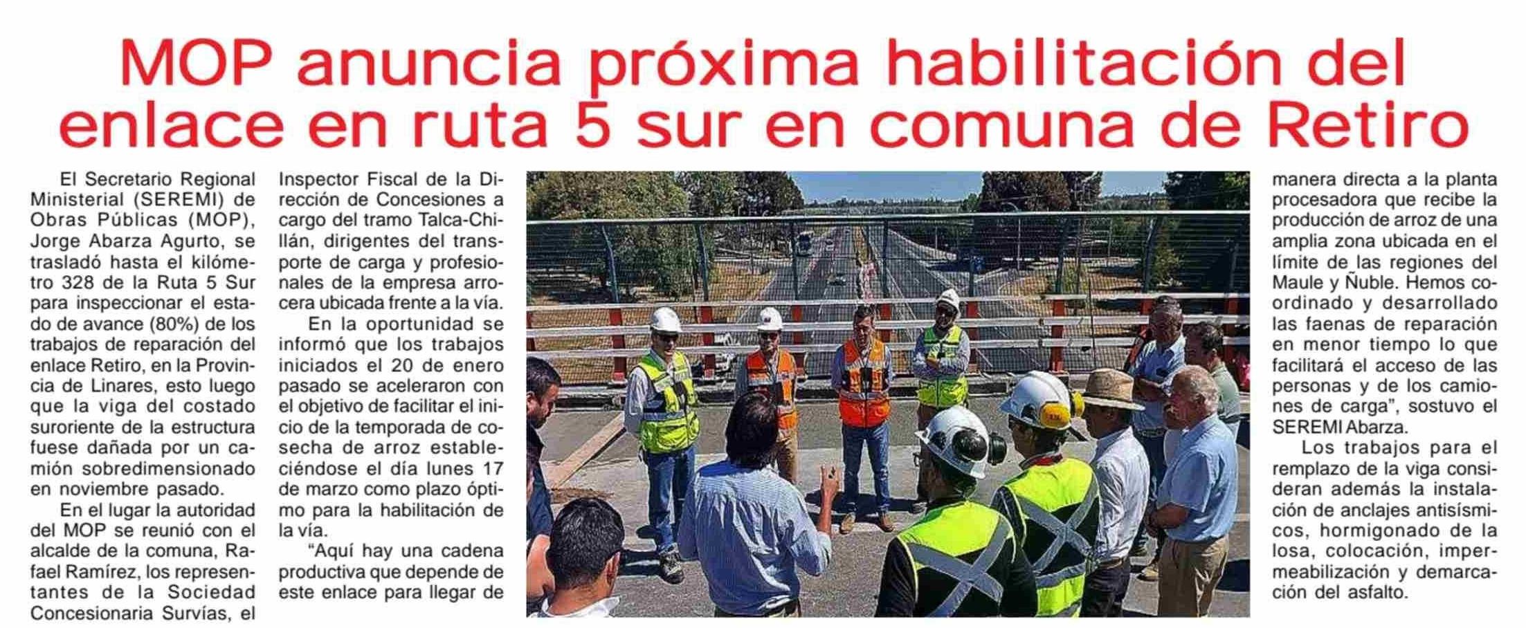 MOP anuncia próxima habilitación del enlace en ruta 5 sur en comuna de Retiro