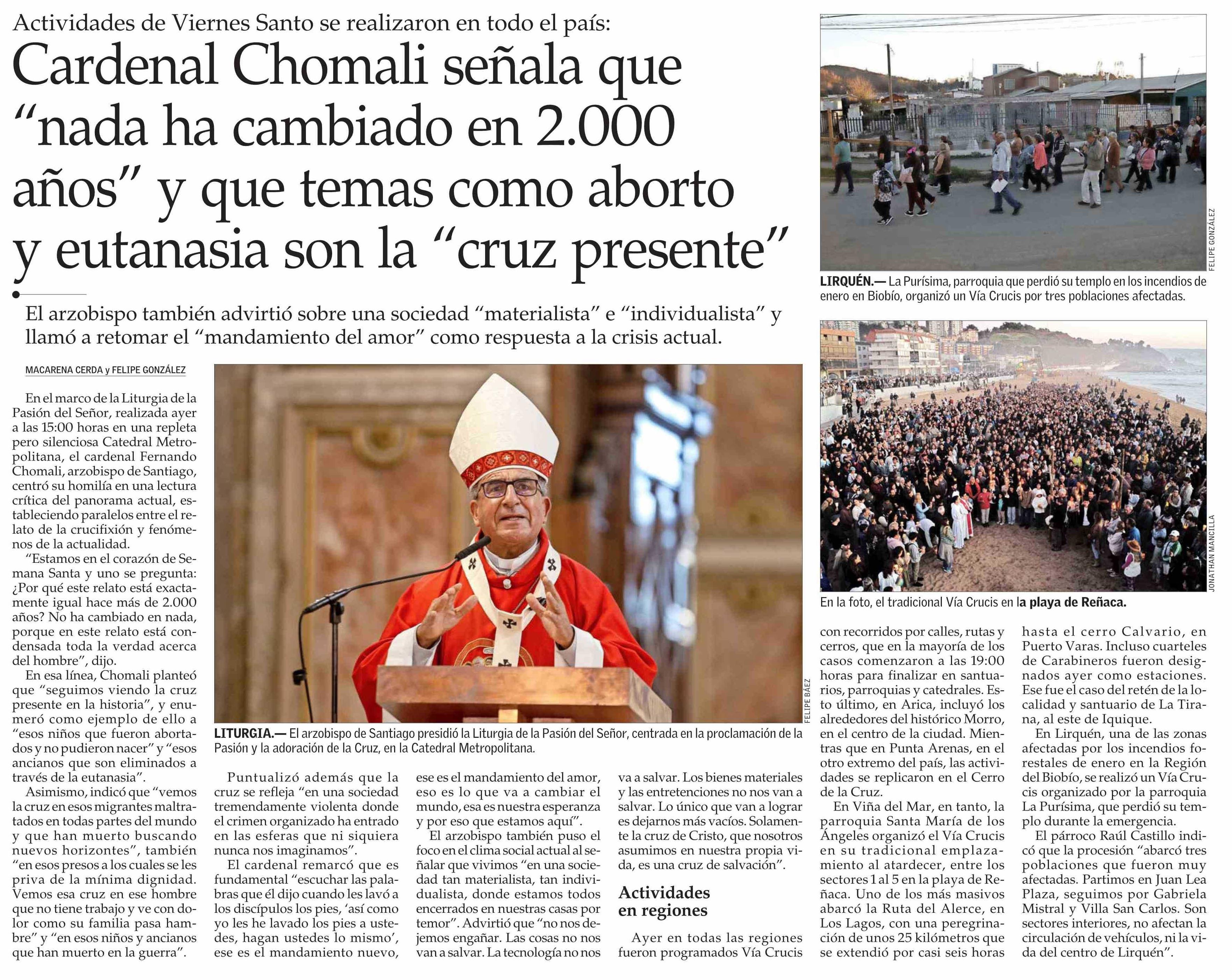 Cardenal Chomali señala que “nada ha cambiado en 2.000 años” y que temas como aborto y eutanasia son la "cruz presente"