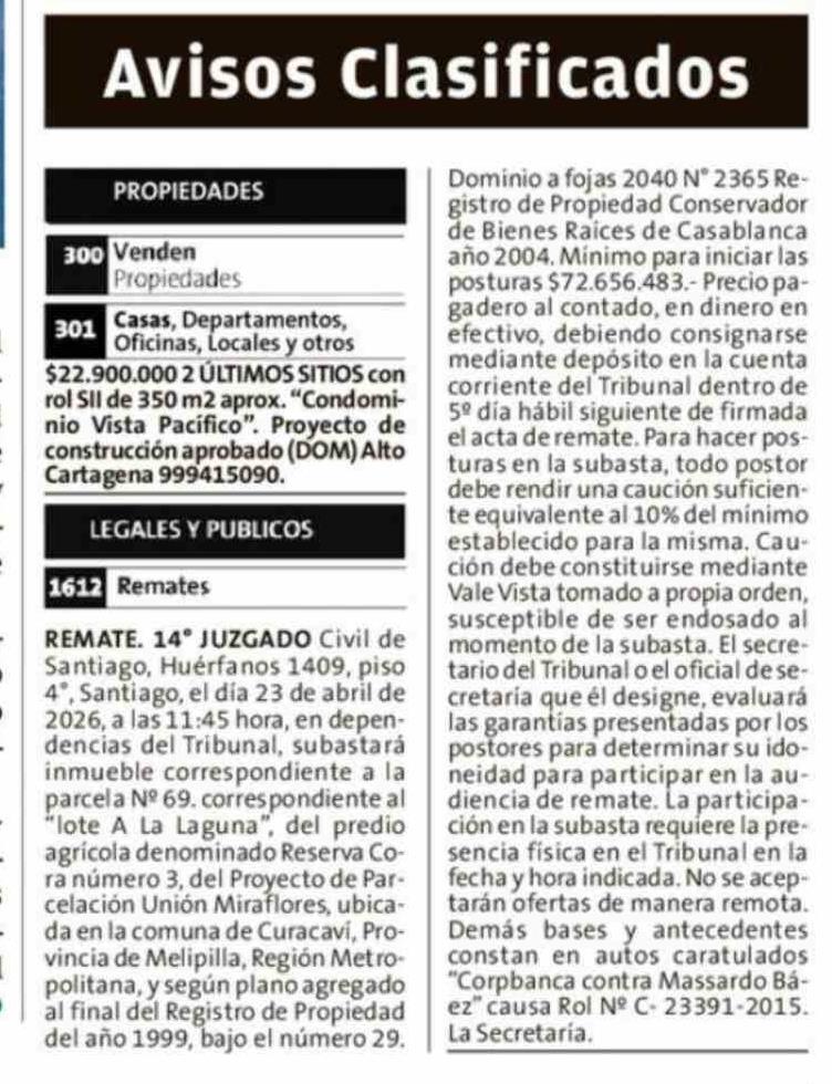 Título: REMATE. 14° JUZGADO Civil de Santiago, Huérfanos 1409, piso 4°, Santiago, el día 23 de abril de 2026, a las 11:45 hora, en dependencias del Tribunal, subastará inmueble correspondiente a la parcela Nº 69. correspondiente al "lote A La Laguna", del predio agrícola denominado Reserva Cora número 3, de