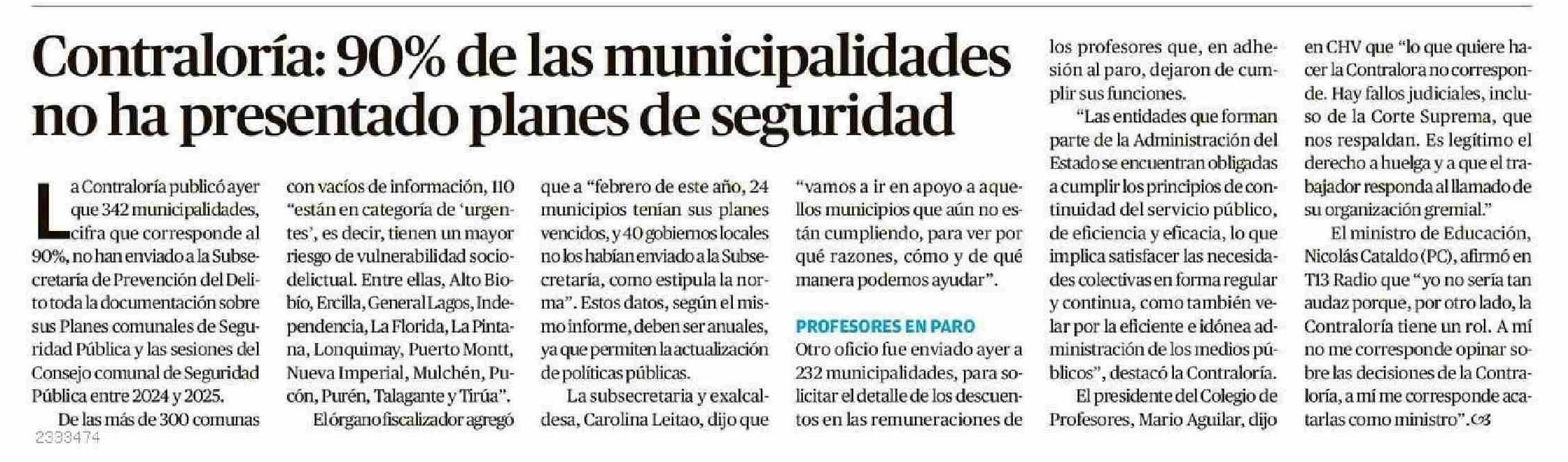 Contraloría: 90% de las municipalidades no ha presentado planes de seguridad
