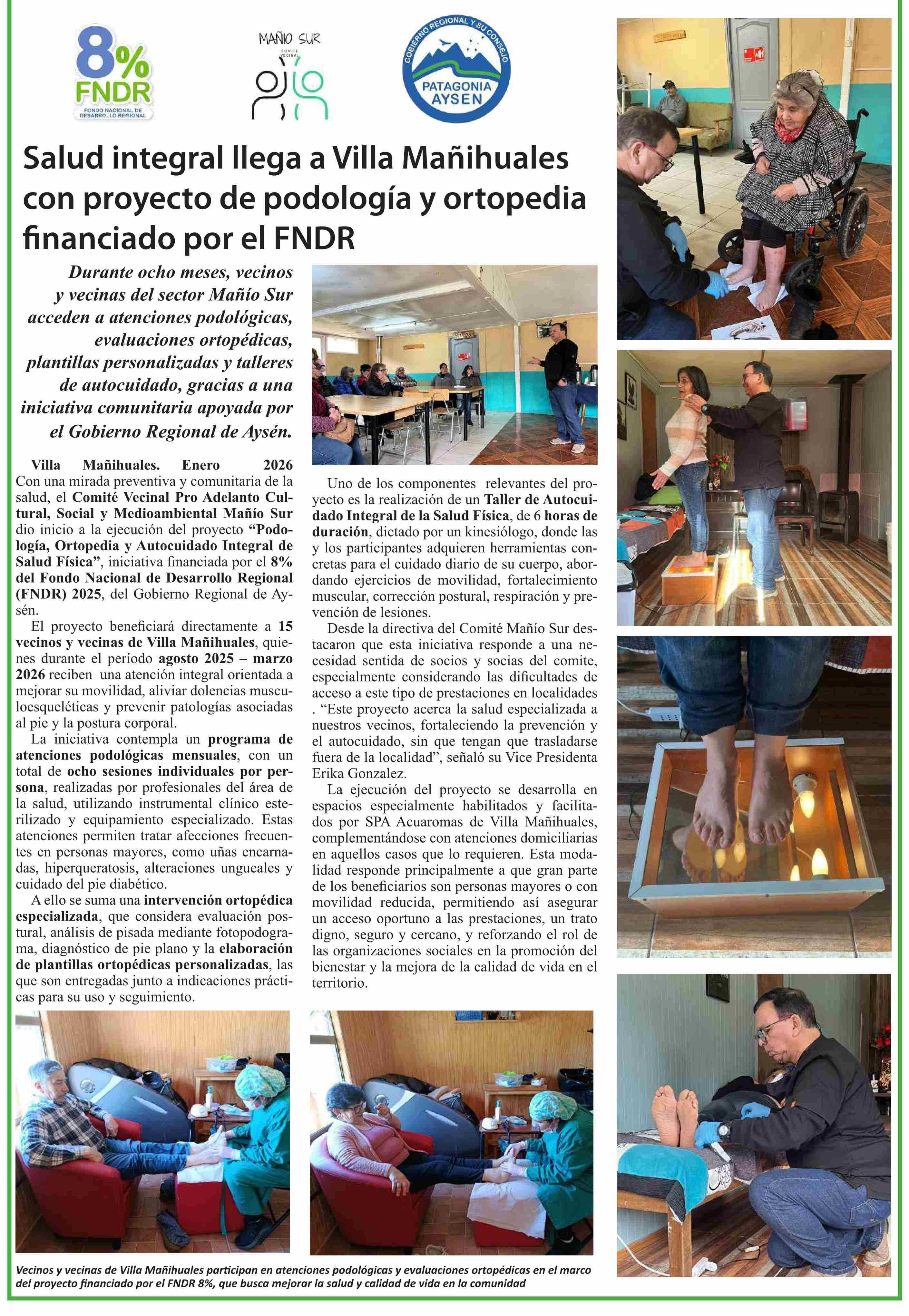Salud integral llega a Villa Mañihuales con proyecto de podología y ortopedia financiado por el FNDR