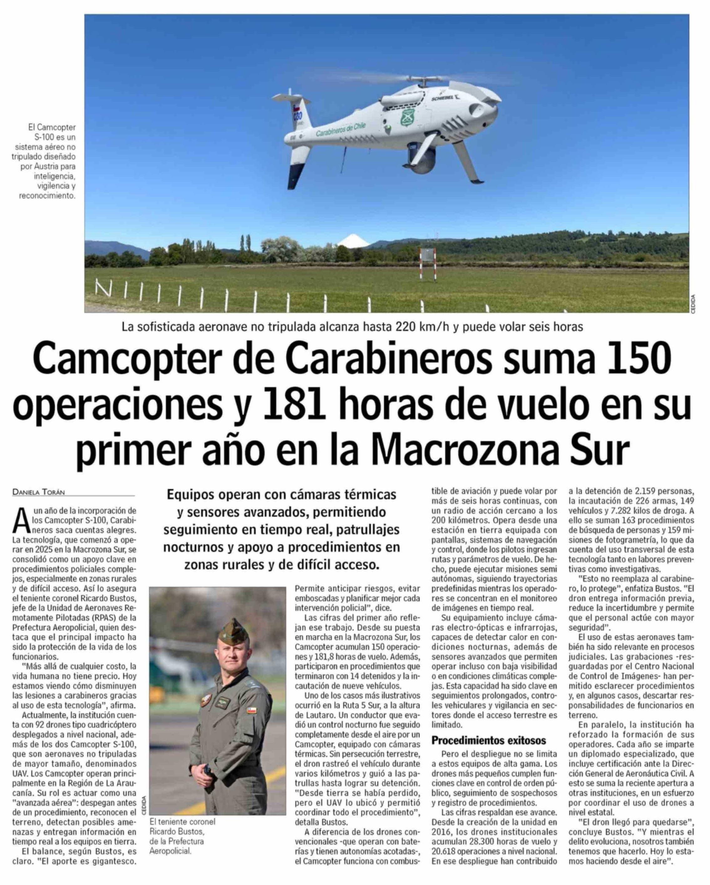 Camcopter de Carabineros suma 150 operaciones y 181 horas de vuelo en su primer año en la Macrozona Sur