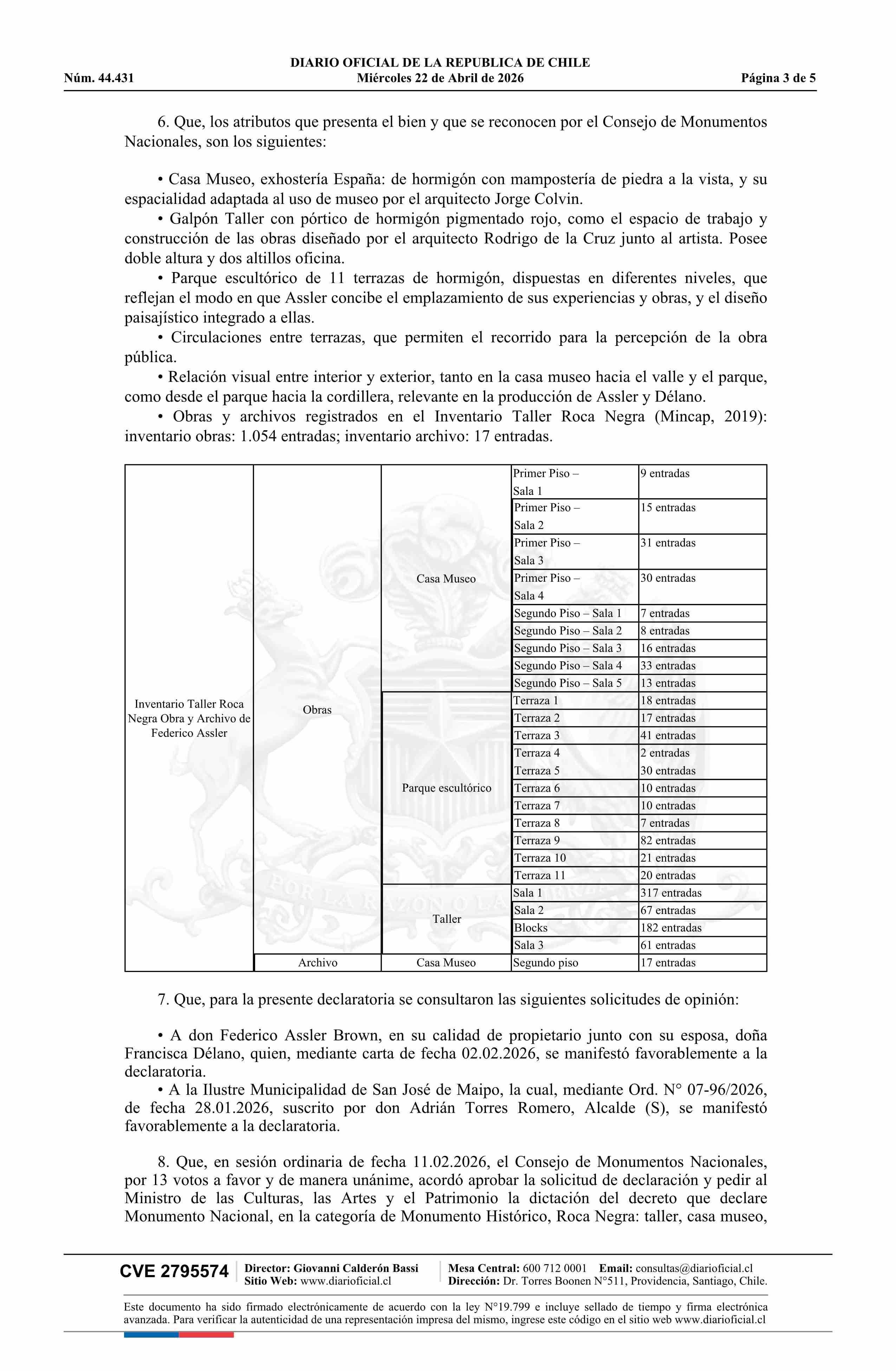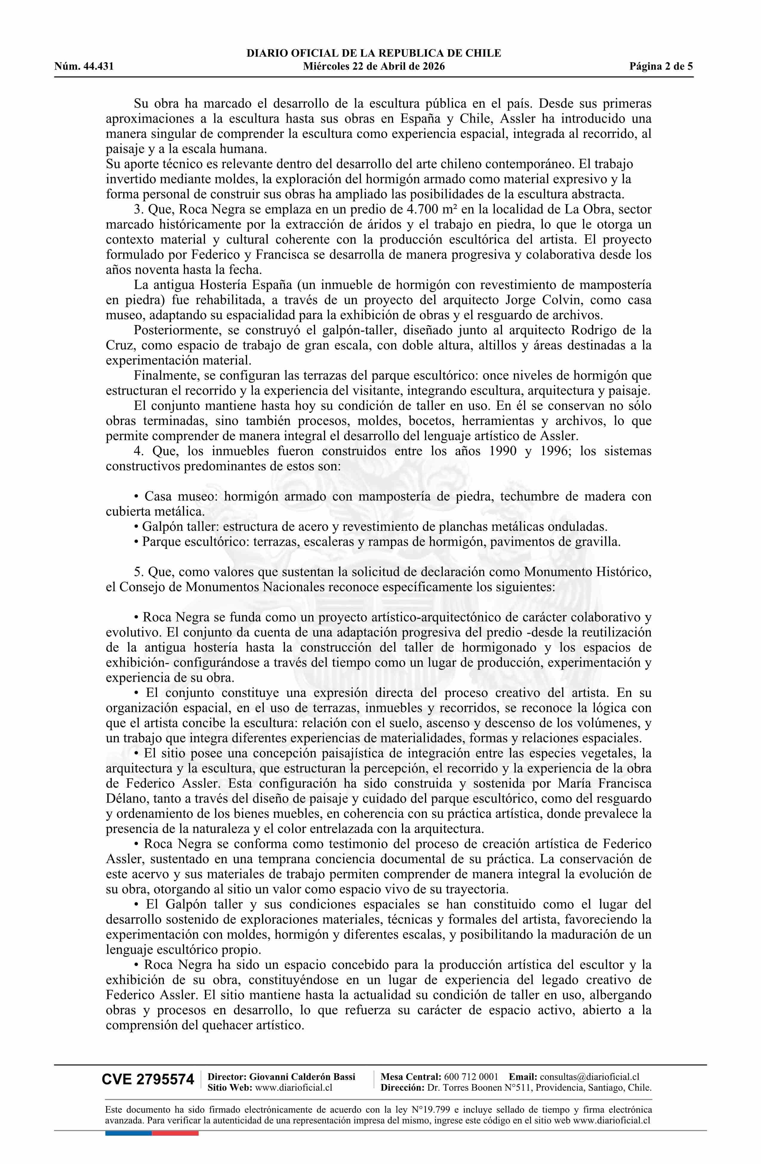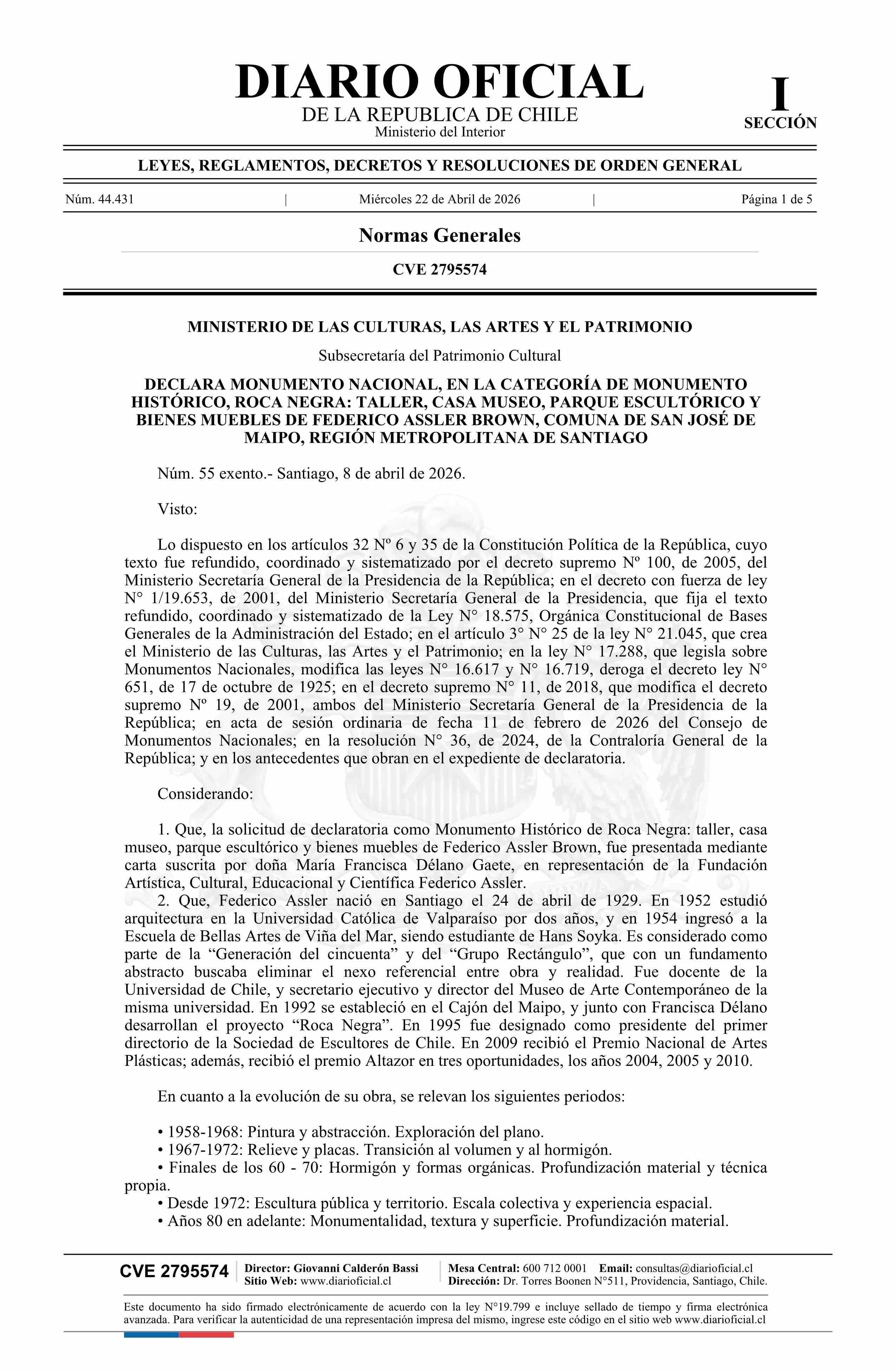 Título: Decreto exento número 55, de 2026.- Declara Monumento Nacional, en la categoría de Monumento Histórico, a Roca Negra: Taller, Casa Museo, Parque Escultórico y Bienes Muebles de Federico Assler Brown, comuna de San José de Maipo, Región Metropolitana de Santiago