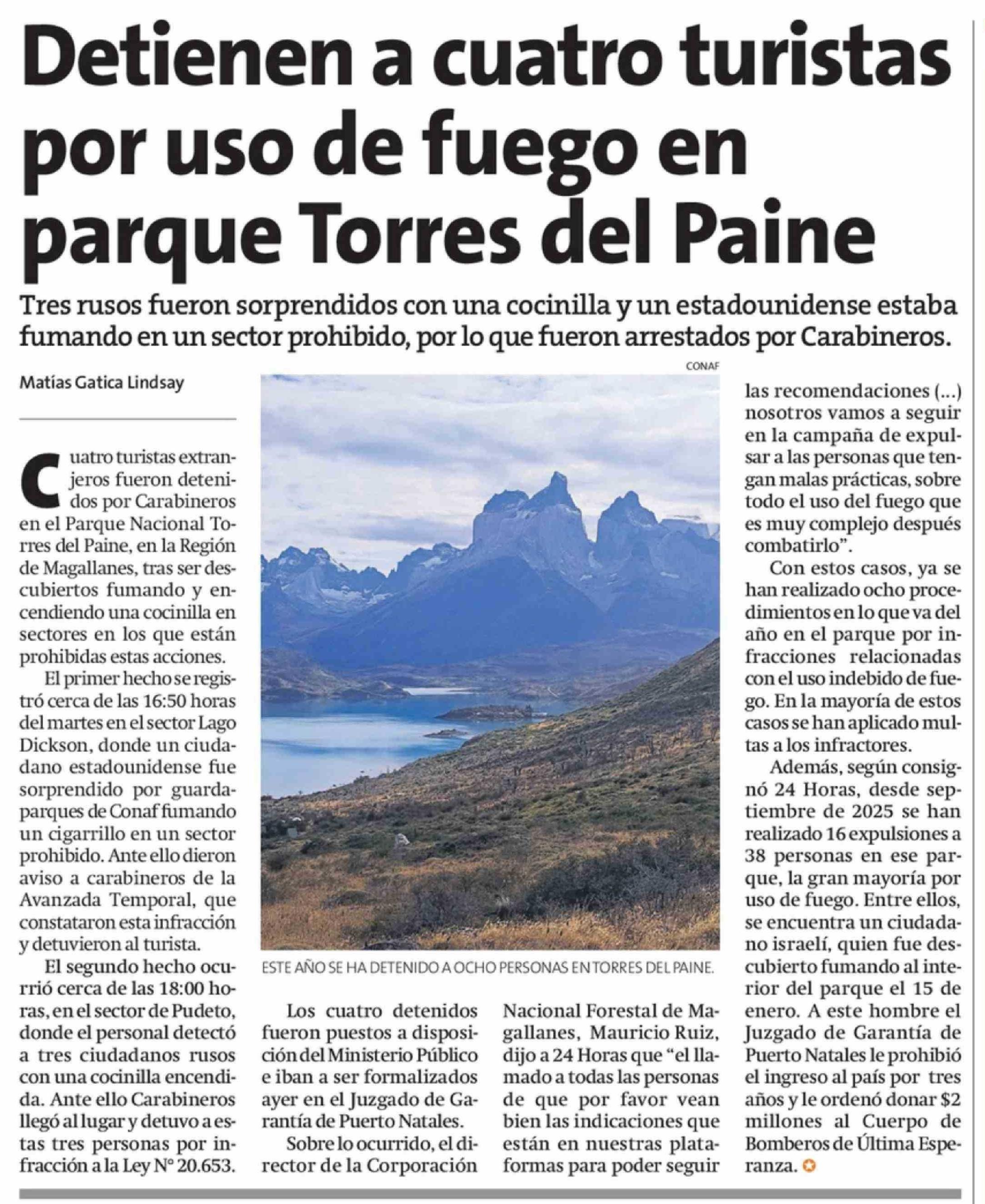 Detienen a cuatro turistas por uso de fuego en parque Torres del Paine