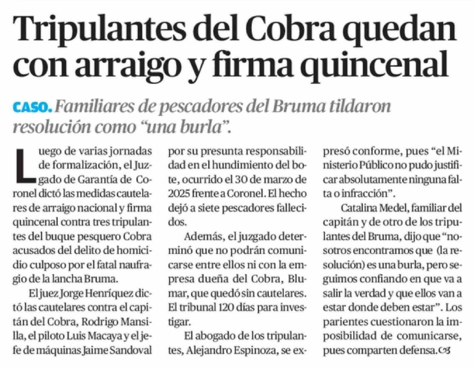 Tripulantes del Cobra quedan con arraigo y firma quincenal
