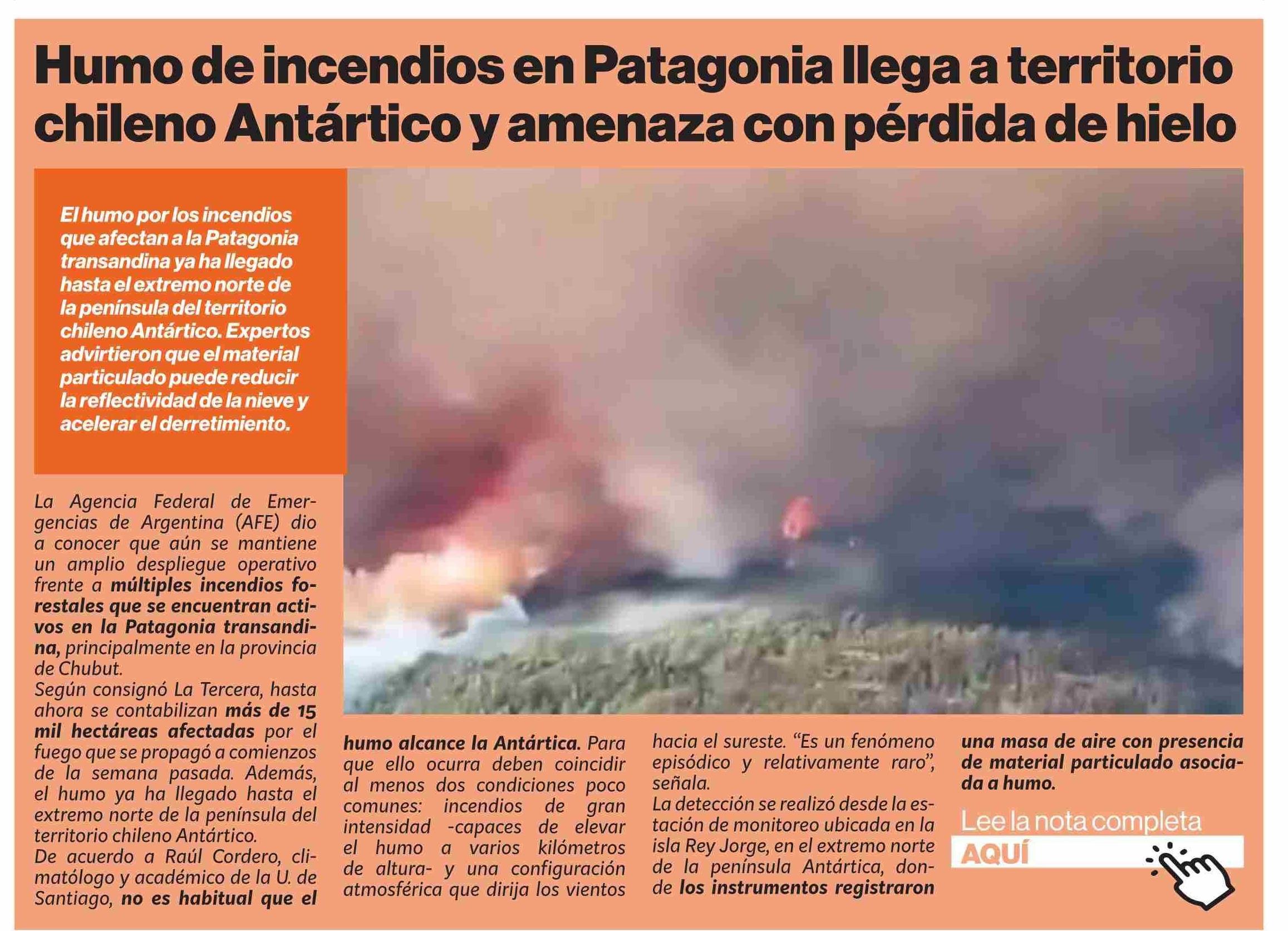 Humo de incendios en Patagonia llega a territorio chileno Antártico y amenaza con pérdida de hielo