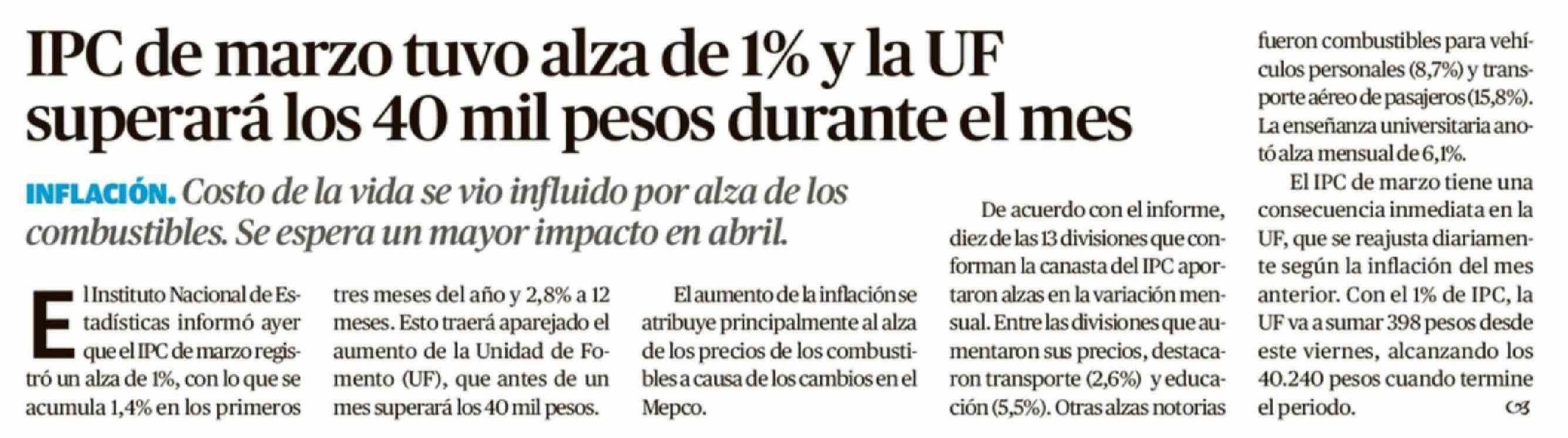 IPC de marzo tuvo alza de 1% y la UF superará los 40 mil pesos durante el mes