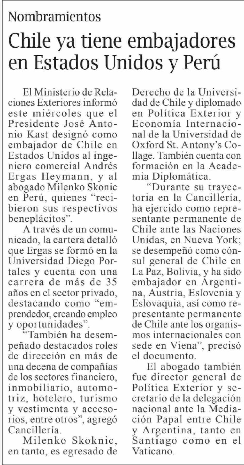 Chile ya tiene embajadores en Estados Unidos y Perú