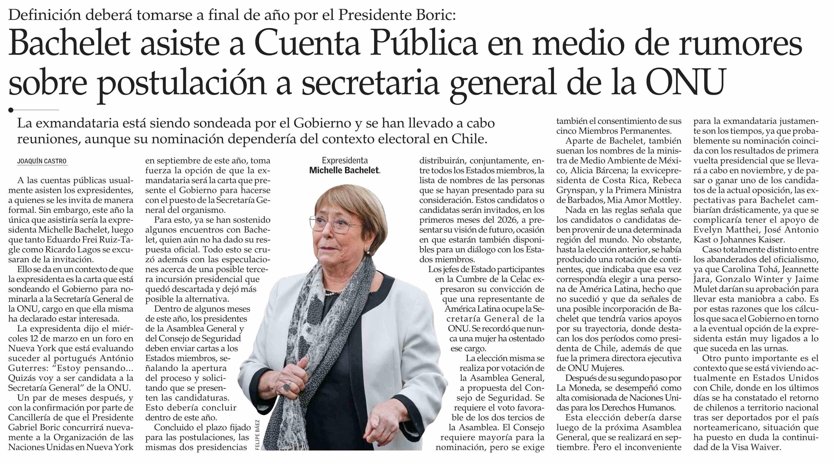 Bachelet asiste a Cuenta Pública en medio de rumores sobre postulación a secretaria general de la ONU