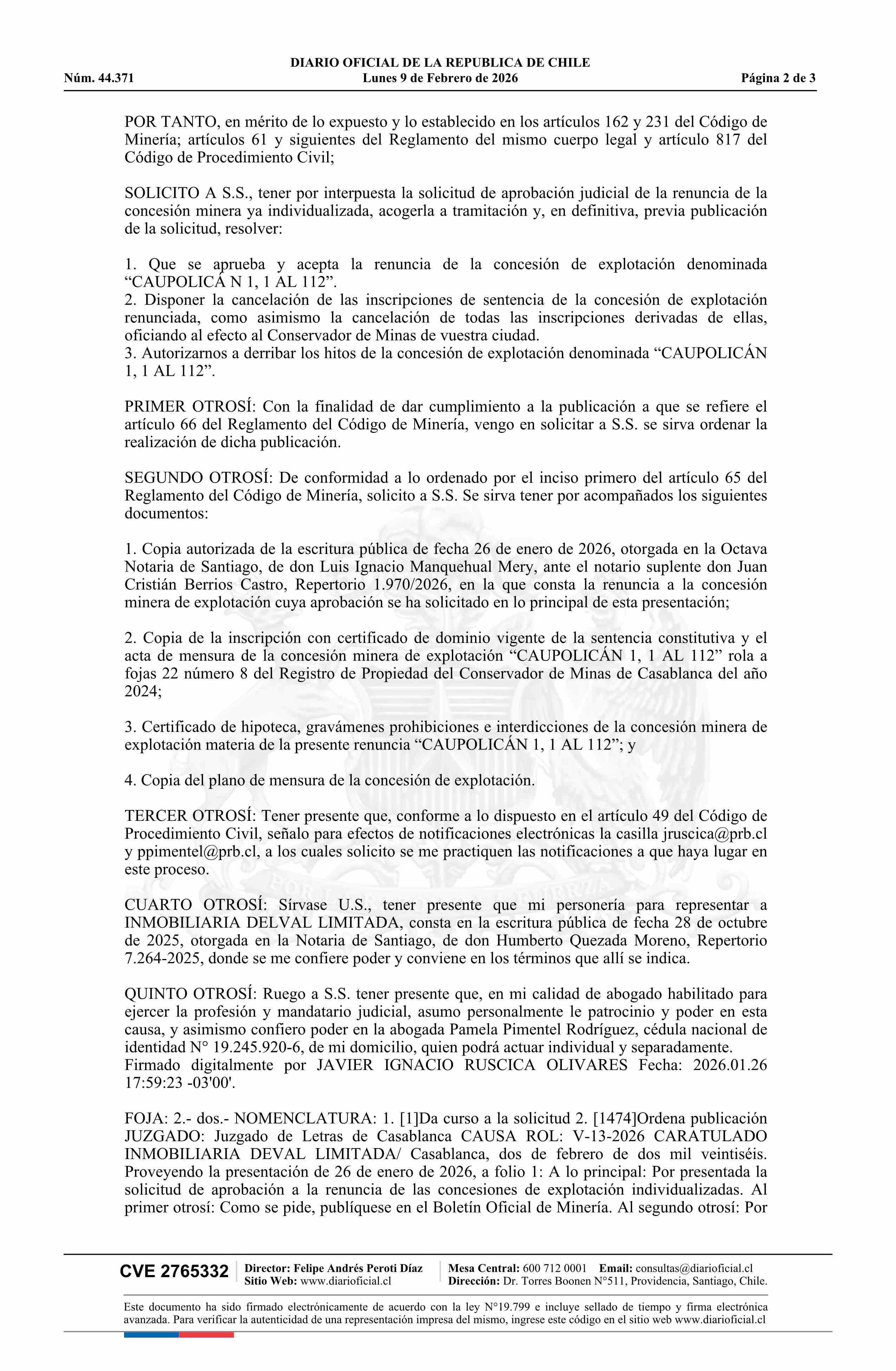 DIARIO OFICIAL CHILE - BOLETÍN OFICIAL DE MINERÍA (DIARIO OFICIAL CHILE – BOM – RENUNCIAS CONCESIÓN)