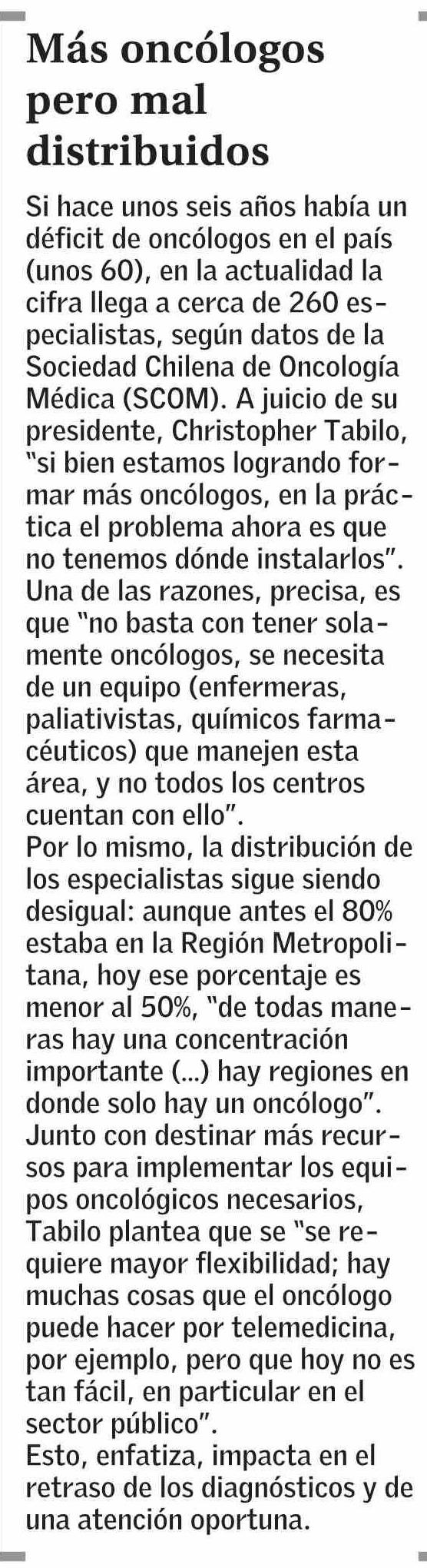 | Título: | Más oncólogos pero mal distribuidos Si hace unos seis años había un déficit de oncólogos en el país (unos 60), en la actualidad la cifra llega a cerca de 260 especialistas, según datos de la Sociedad Chilena de Oncología Médica (SCOM). A juicio de su presidente, Christopher Tabilo, “si bien estamos |
