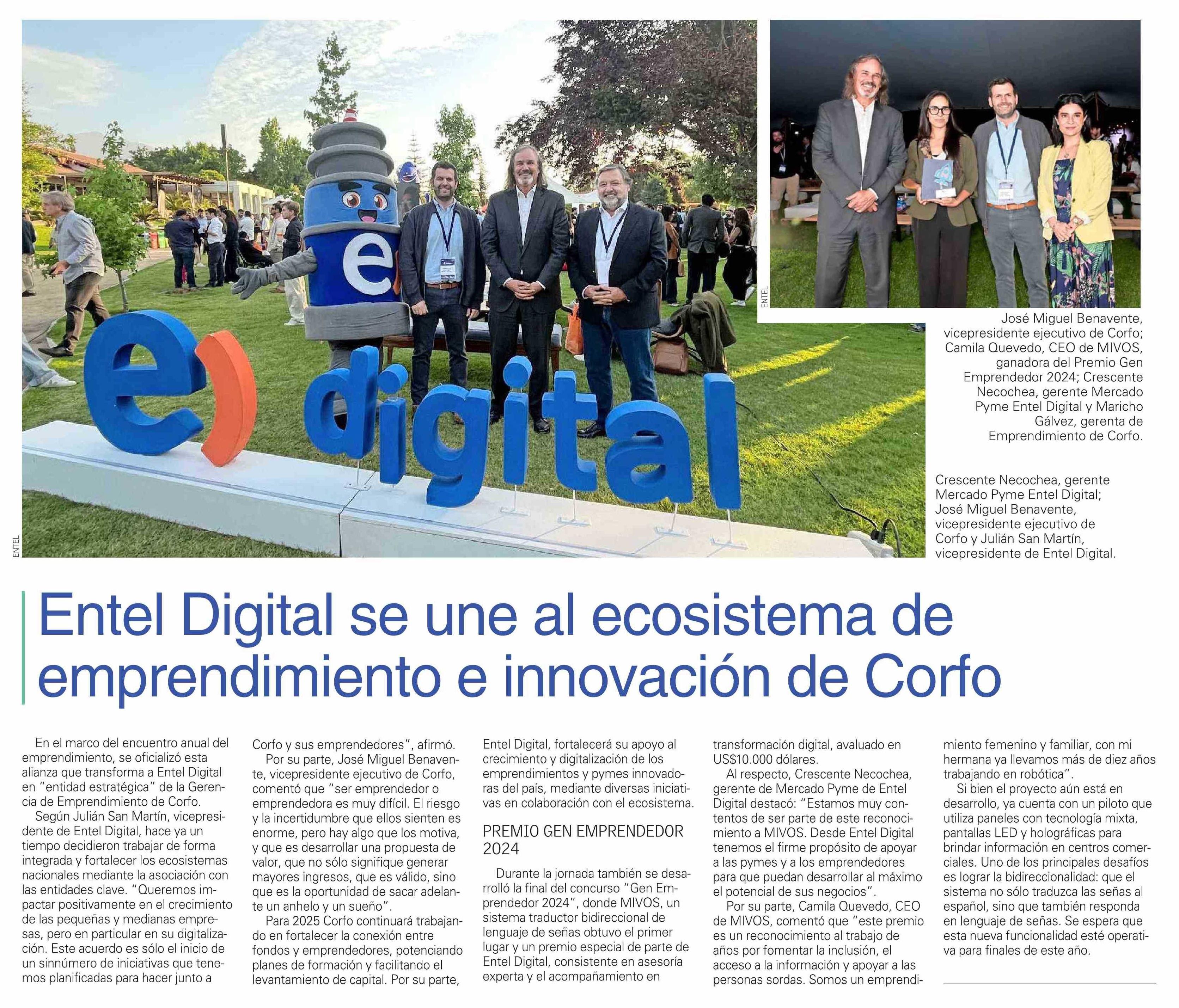 Entel Digital se une al ecosistema de emprendimiento e innovación de Corfo