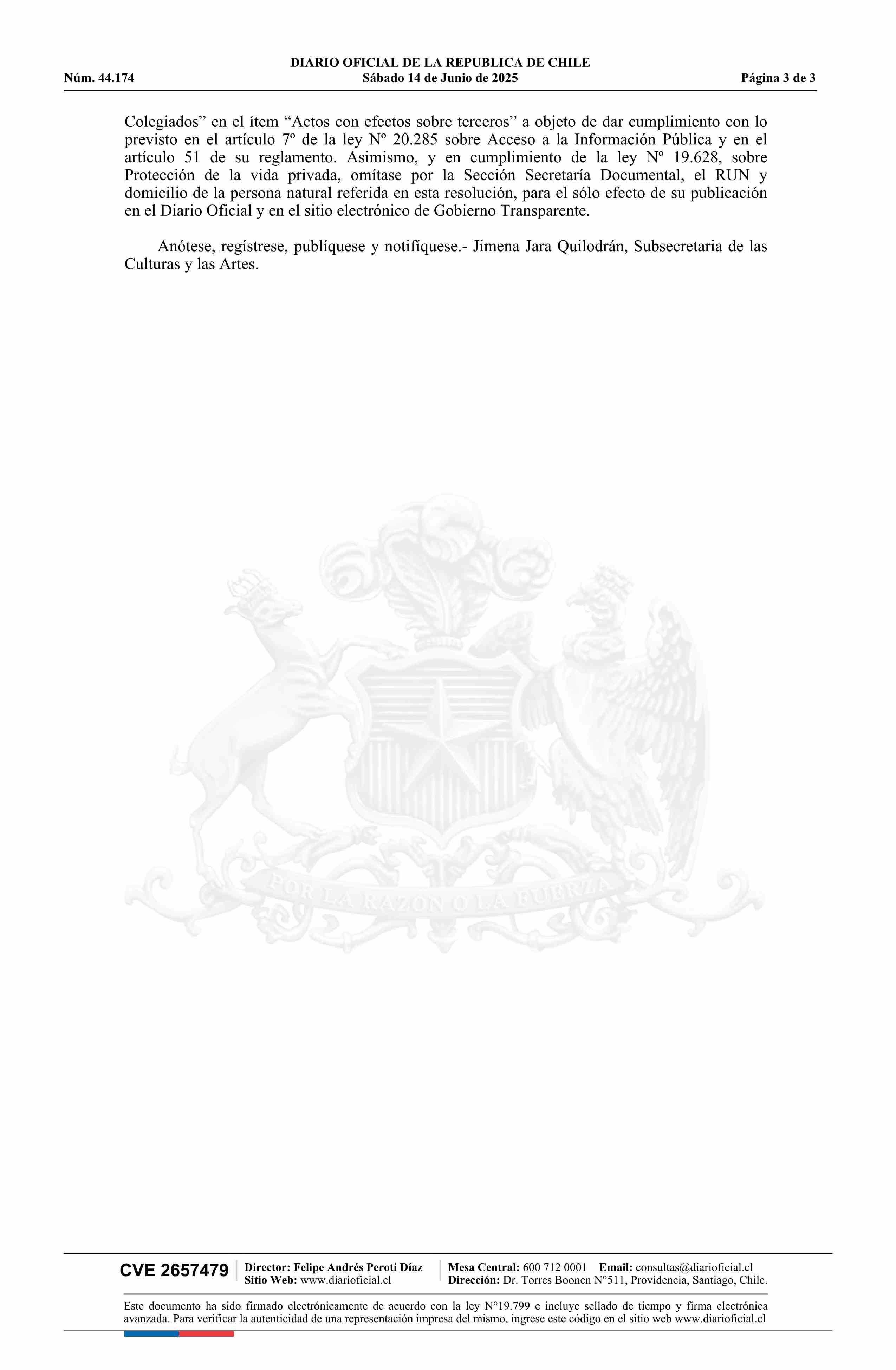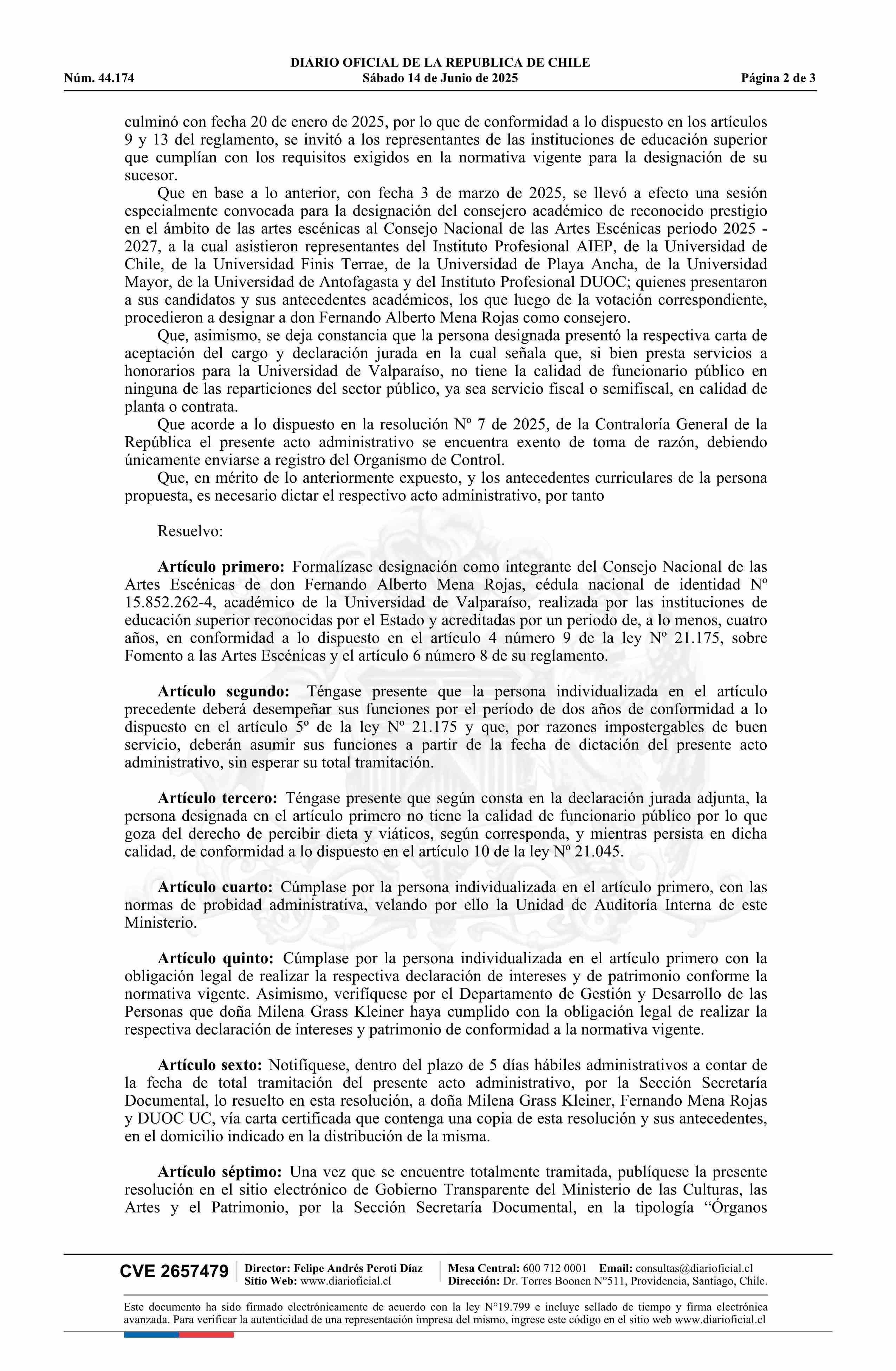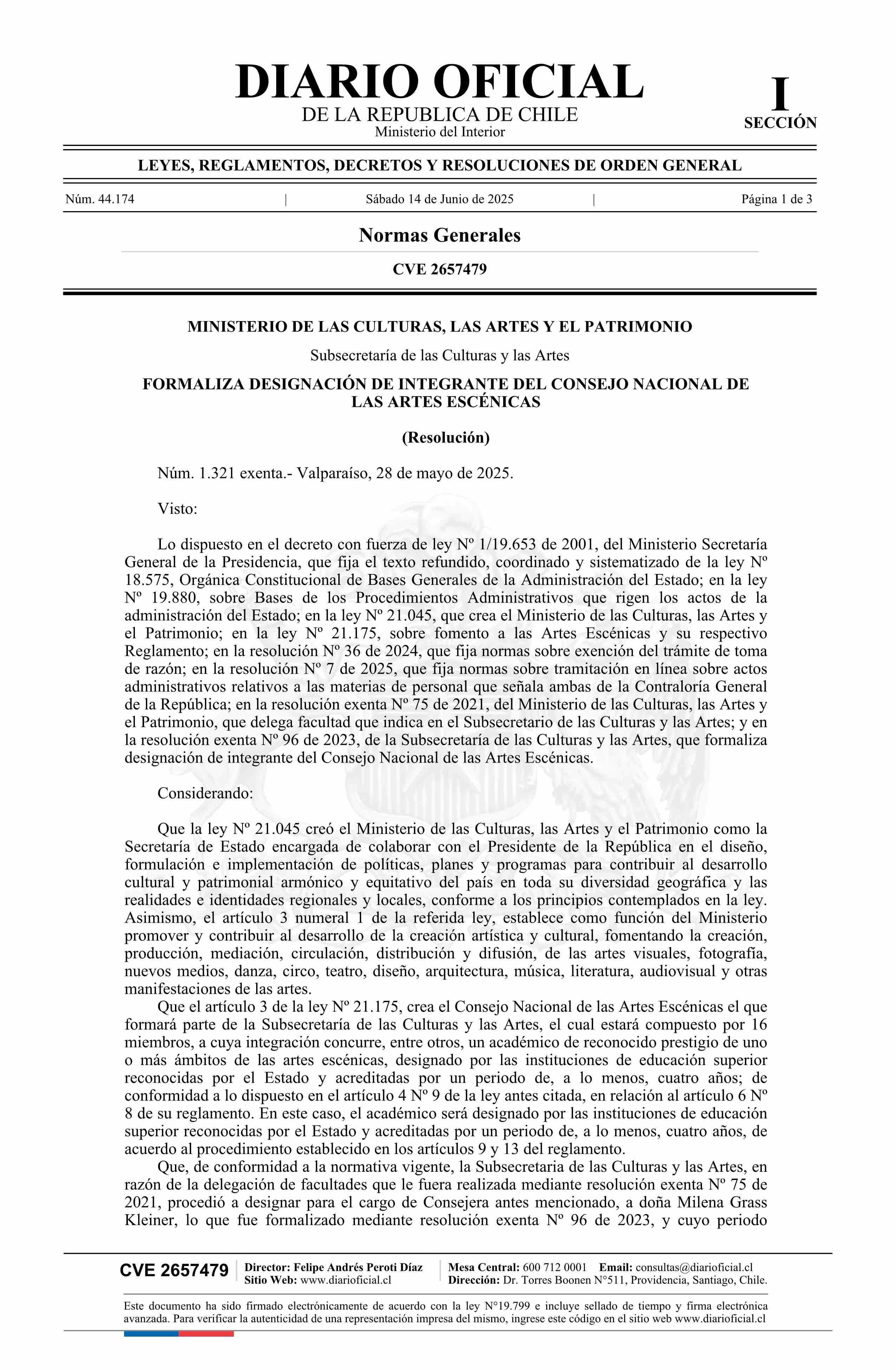 | Título: | Resolución exenta número 1.321, de 2025.- Formaliza designación de integrante del Consejo Nacional de las Artes Escénicas |