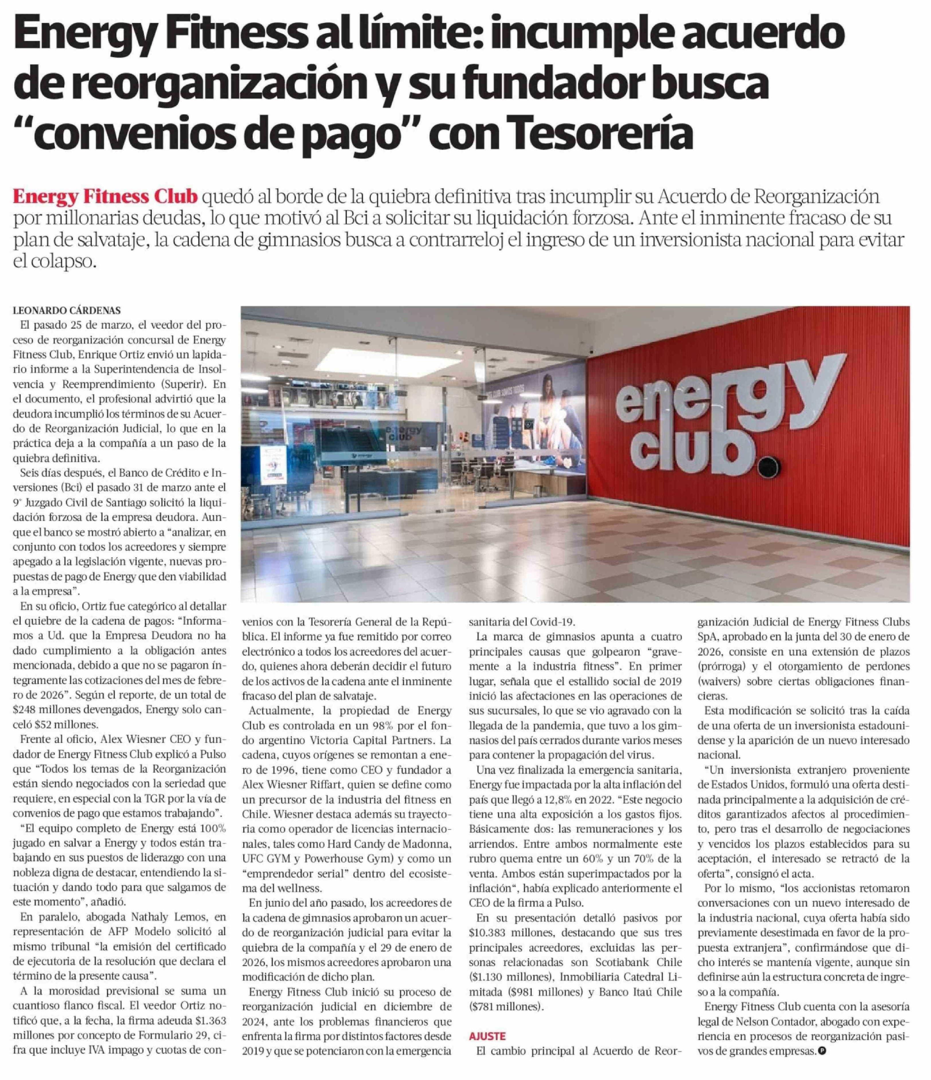 Energy Fitness al límite: incumple acuerdo de reorganización y su fundador busca "convenios de pago" con Tesorería
