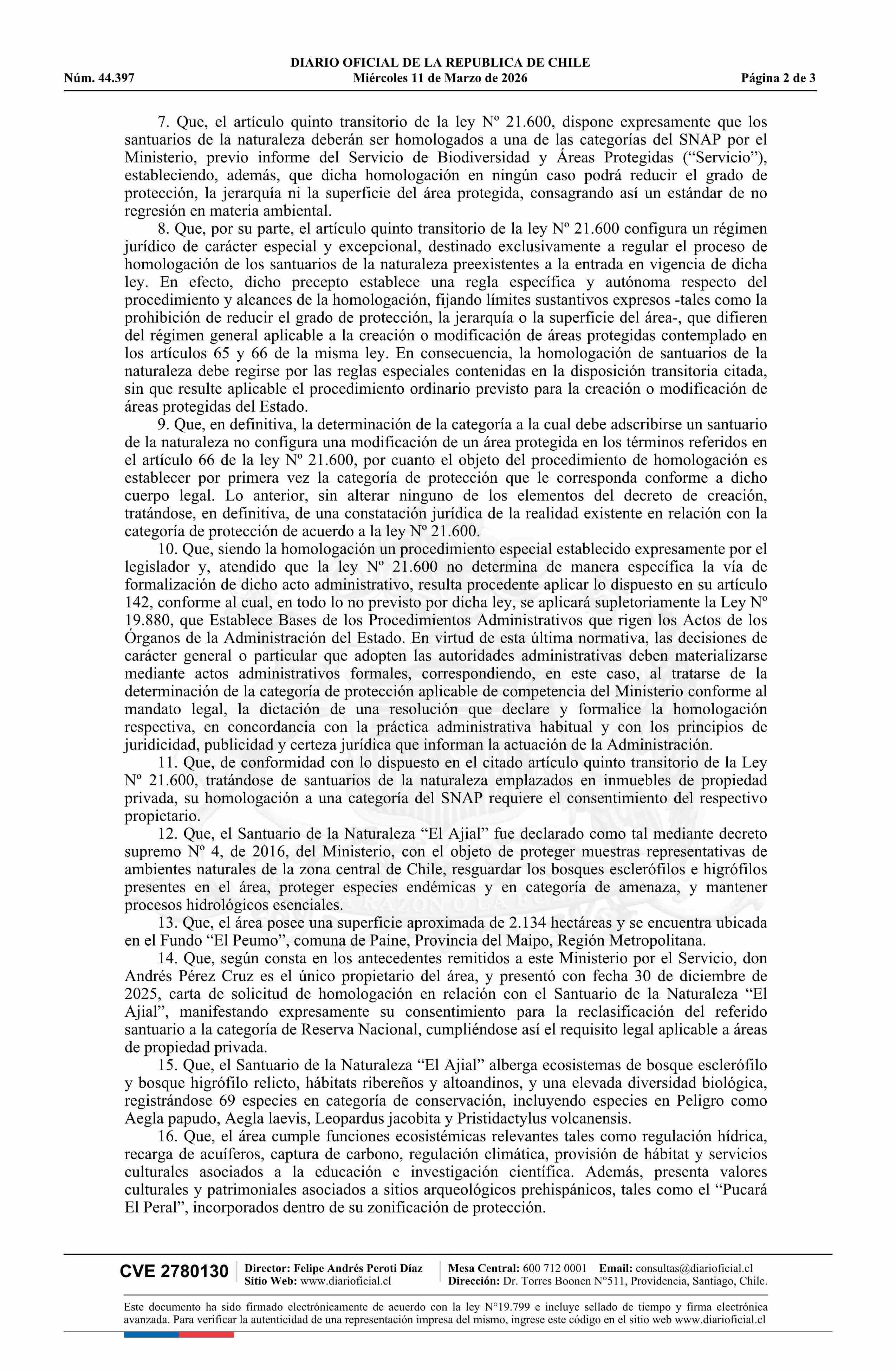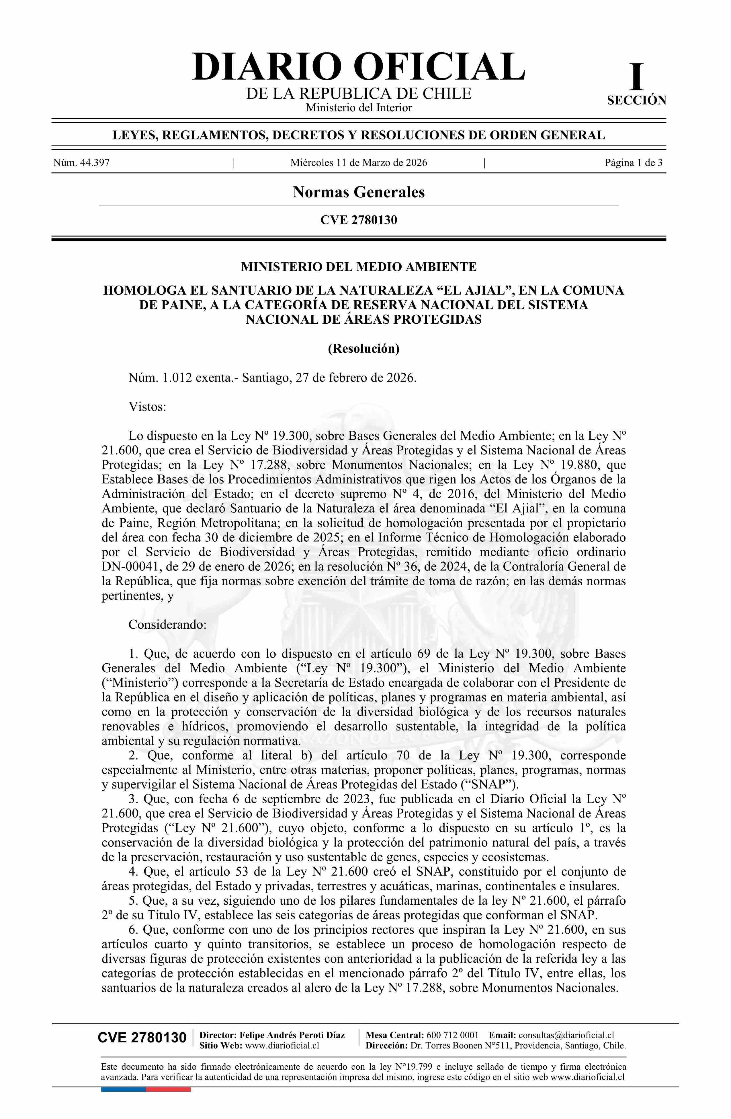 | Título: | Resolución exenta número 1.012, de 2026.- Homologa el Santuario de la Naturaleza El Ajial, en la comuna de Paine, a la Categoría de Reserva Nacional del Sistema Nacional de Áreas Protegidas |