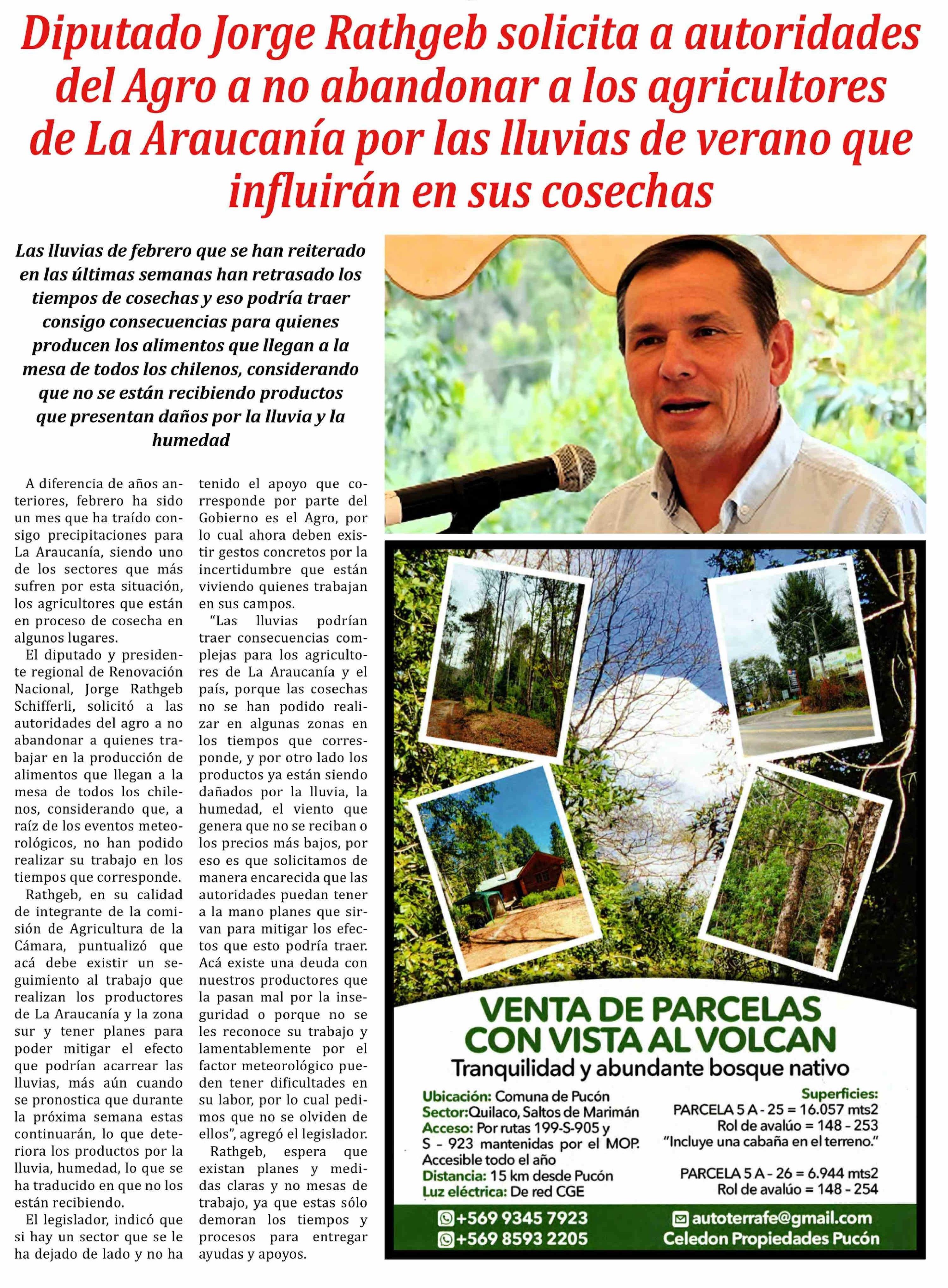 | Título: | Diputado Jorge Rathgeb solicita a autoridades del Agro a no abandonar a los agricultores de La Araucanía por las lluvias de verano que influirán en sus cosechas |