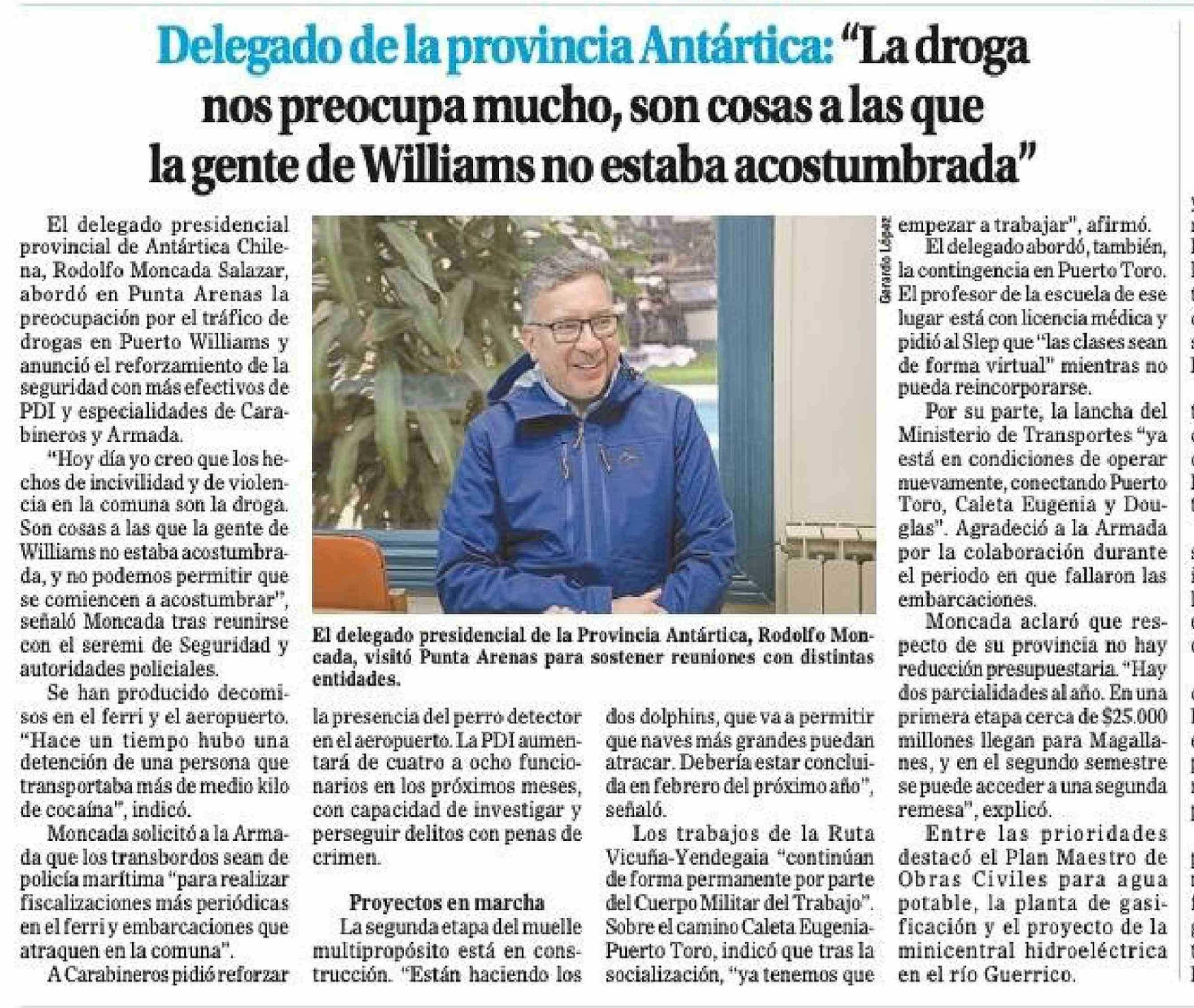 | Título: | Delegado de la provincia Antártica: "La droga nos preocupa mucho, son cosas a las que la gente de Williams no estaba acostumbrada" |