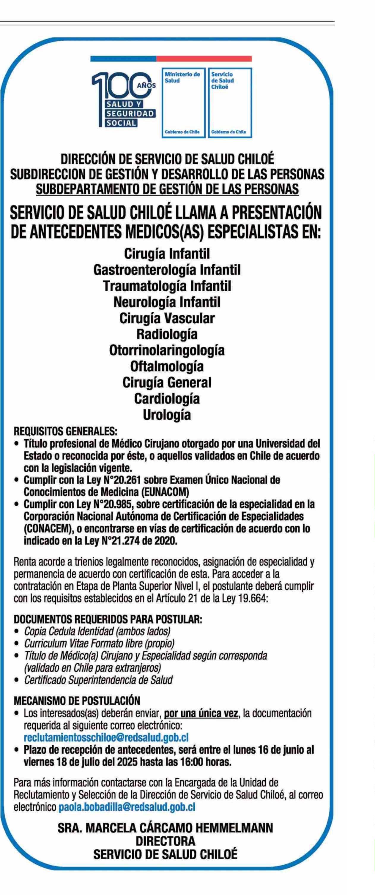SERVICIO DE SALUD CHILOÉ LLAMA A PRESENTACIÓN DE ANTECEDENTES MEDICOS(AS) ESPECIALISTAS EN: