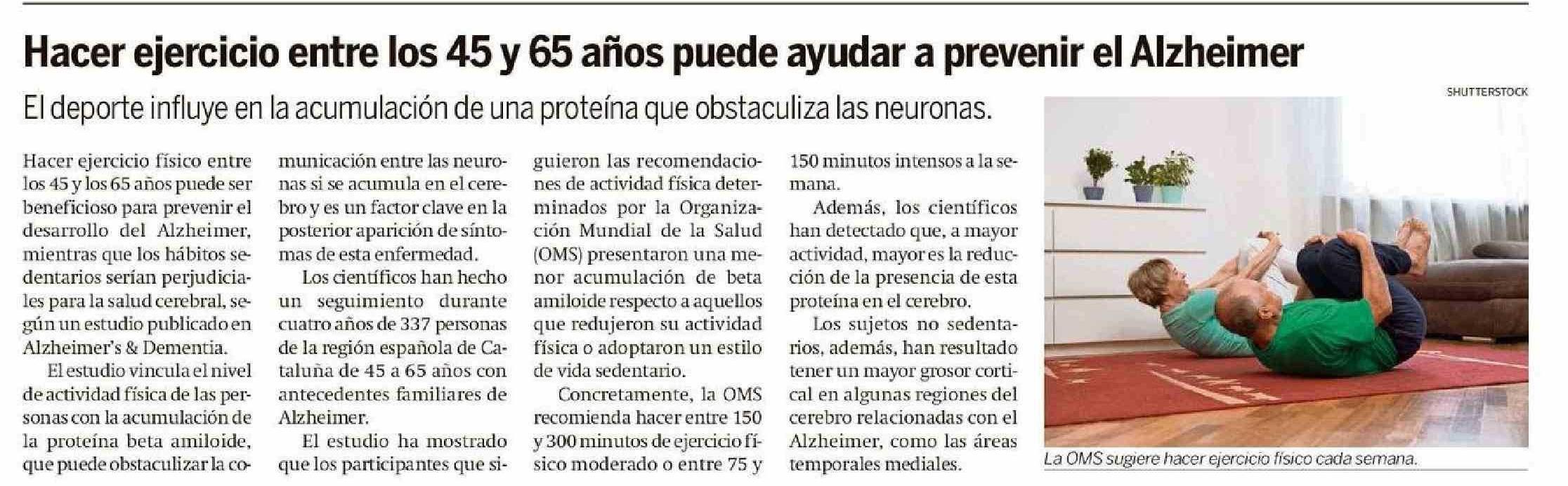 Hacer ejercicio entre los 45 y 65 años puede ayudar a prevenir el Alzheimer