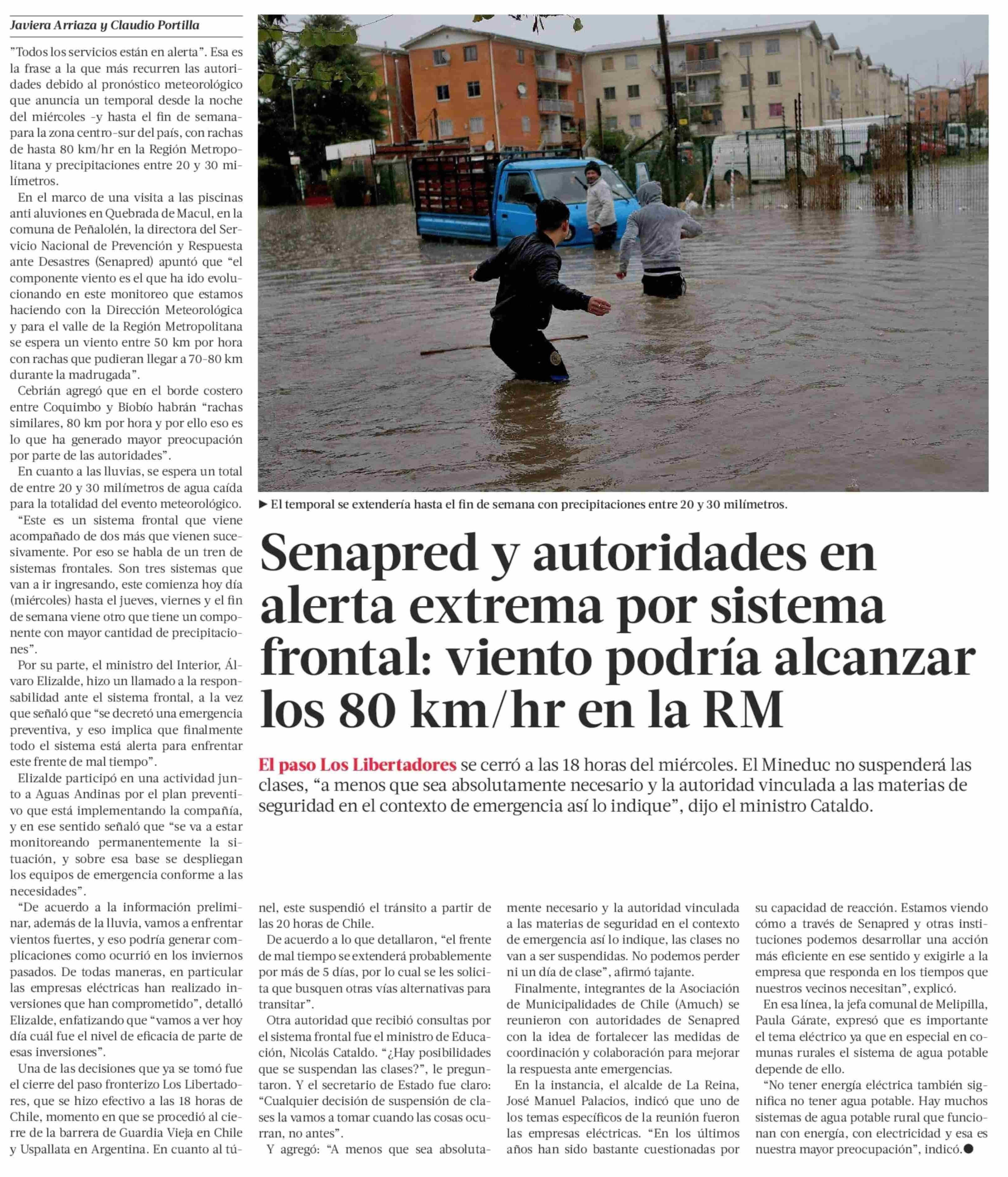 Senapred y autoridades en alerta extrema por sistema frontal: viento podría alcanzar los 80 km/hr en la RM