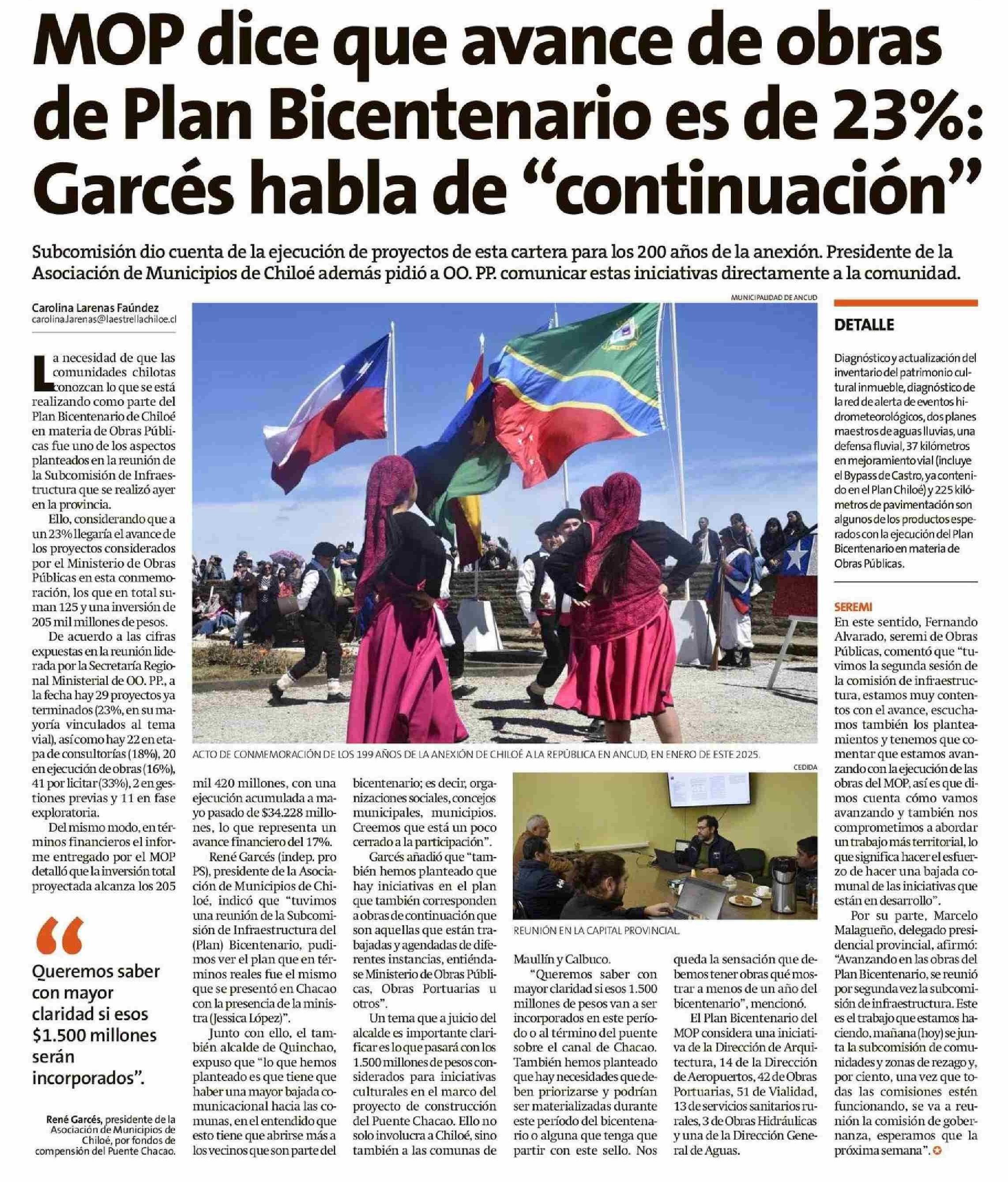 MOP dice que avance de obras de Plan Bicentenario es de 23%: Garcés habla de “continuación”