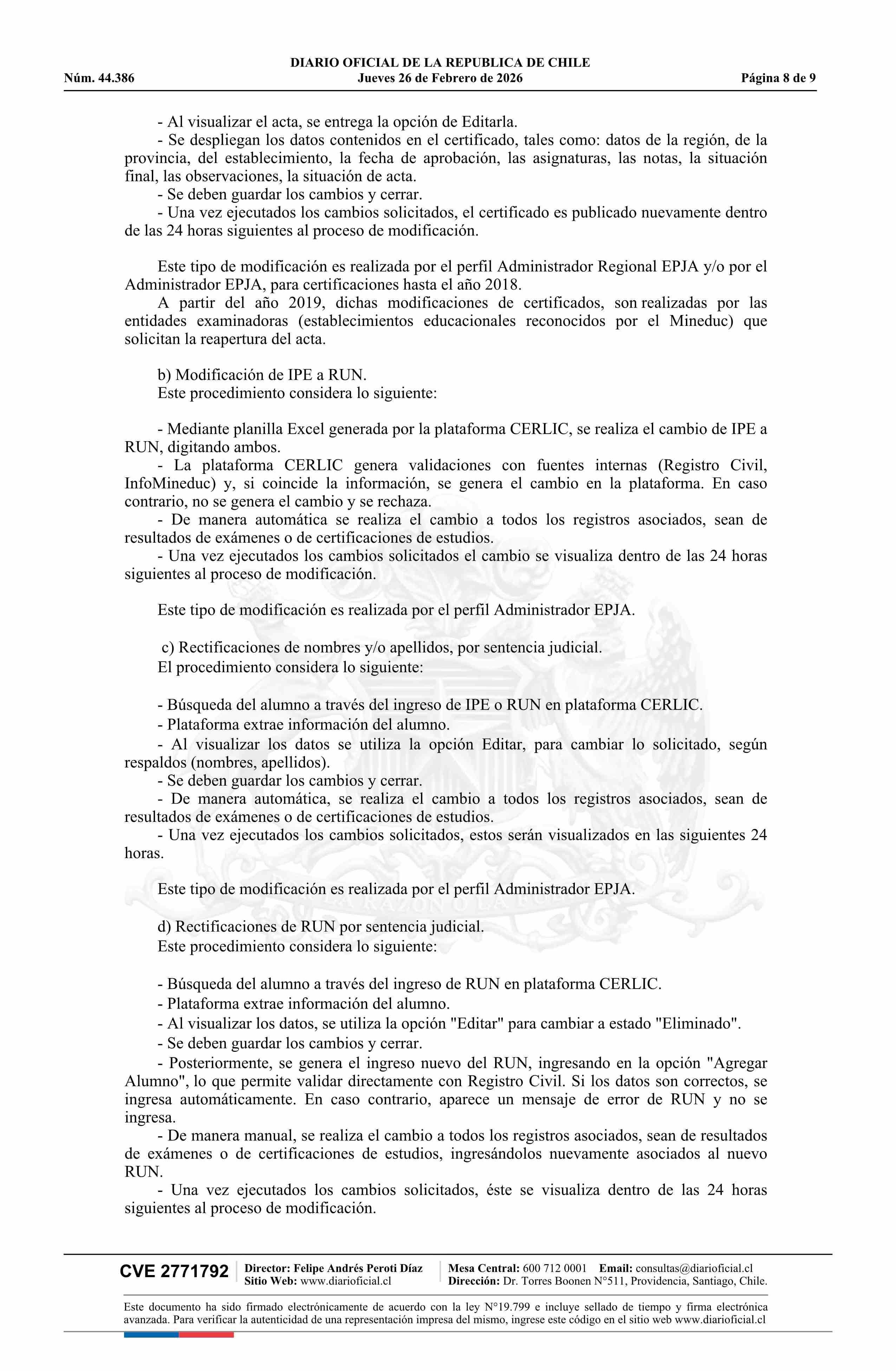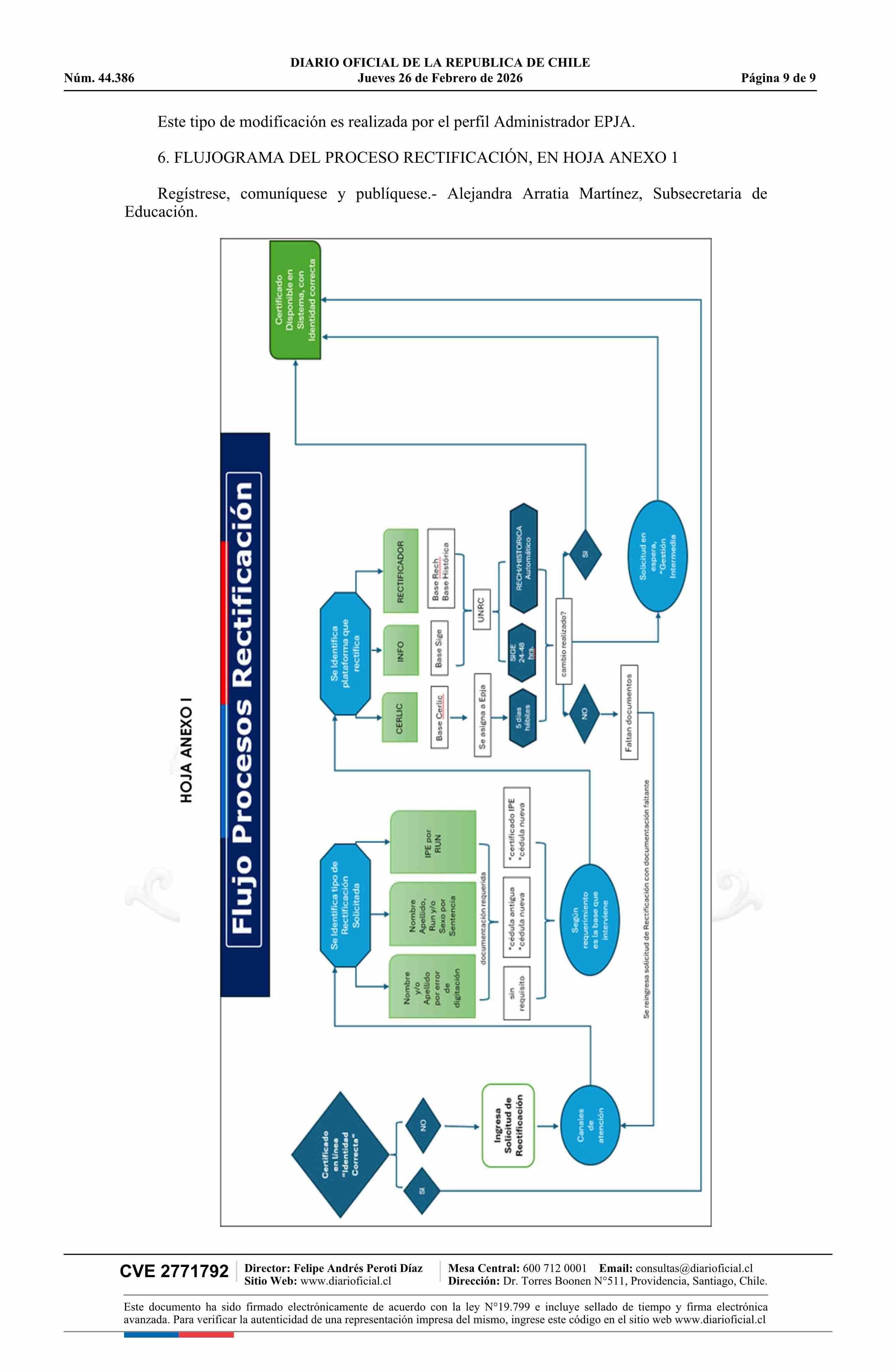 | Título: | Resolución exenta número 688, de 2026.- Aprueba procedimiento de rectificación de certificados de estudios |