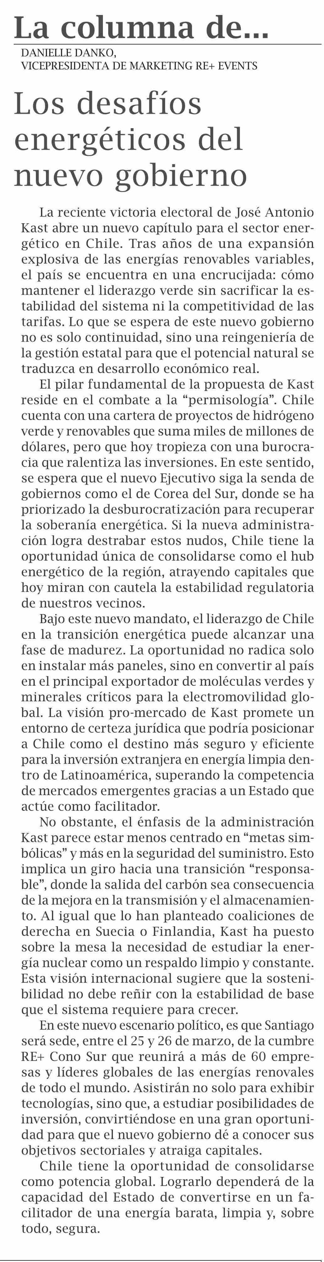 Columnas de Opinión: Los desafíos energéticos del nuevo gobierno