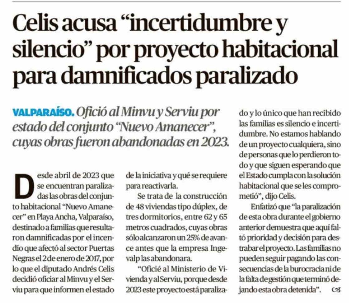 Celis acusa "incertidumbre y silencio" por proyecto habitacional para damnificados paralizado