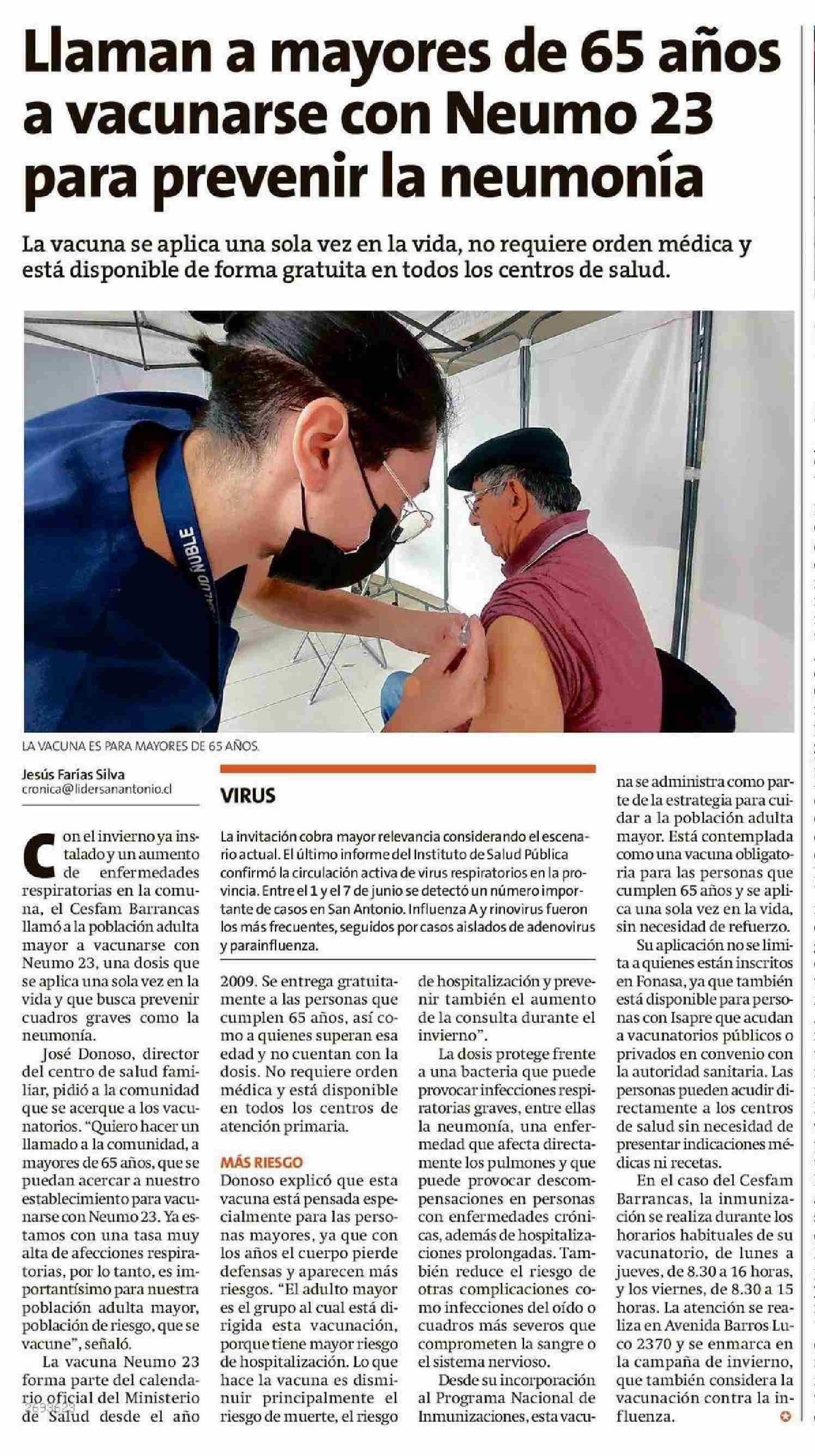 Llaman a mayores de 65 años para prevenir la neumonía a vacunarse con Neumo 23