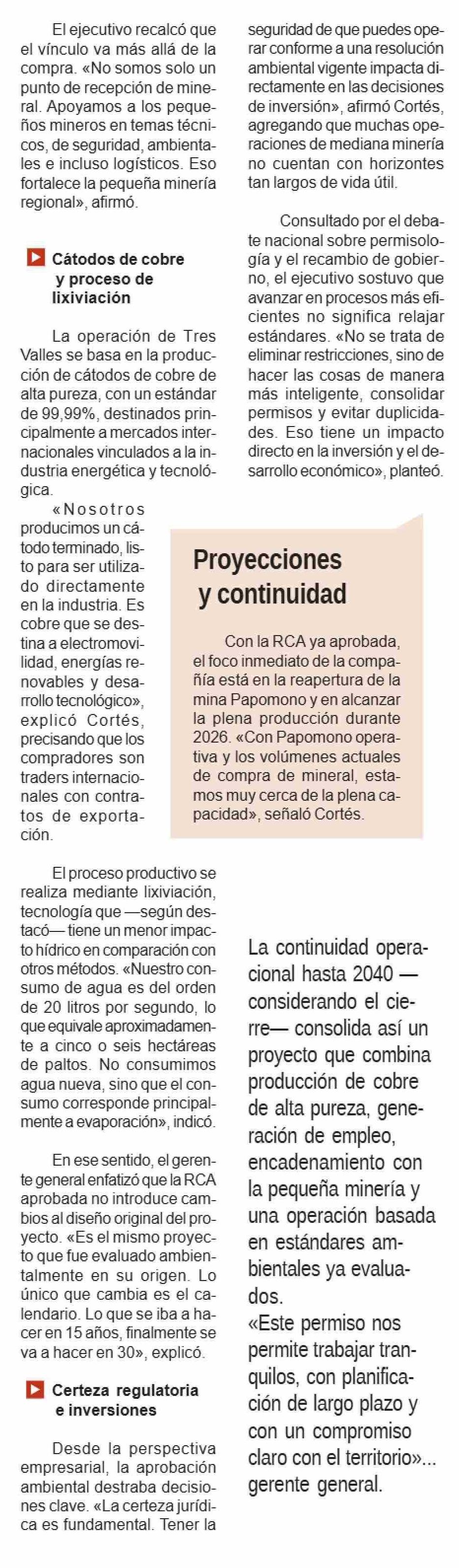 Minera Tres Valles asegura continuidad operacional hasta 2040 y proyecta hasta 800 empleos directos