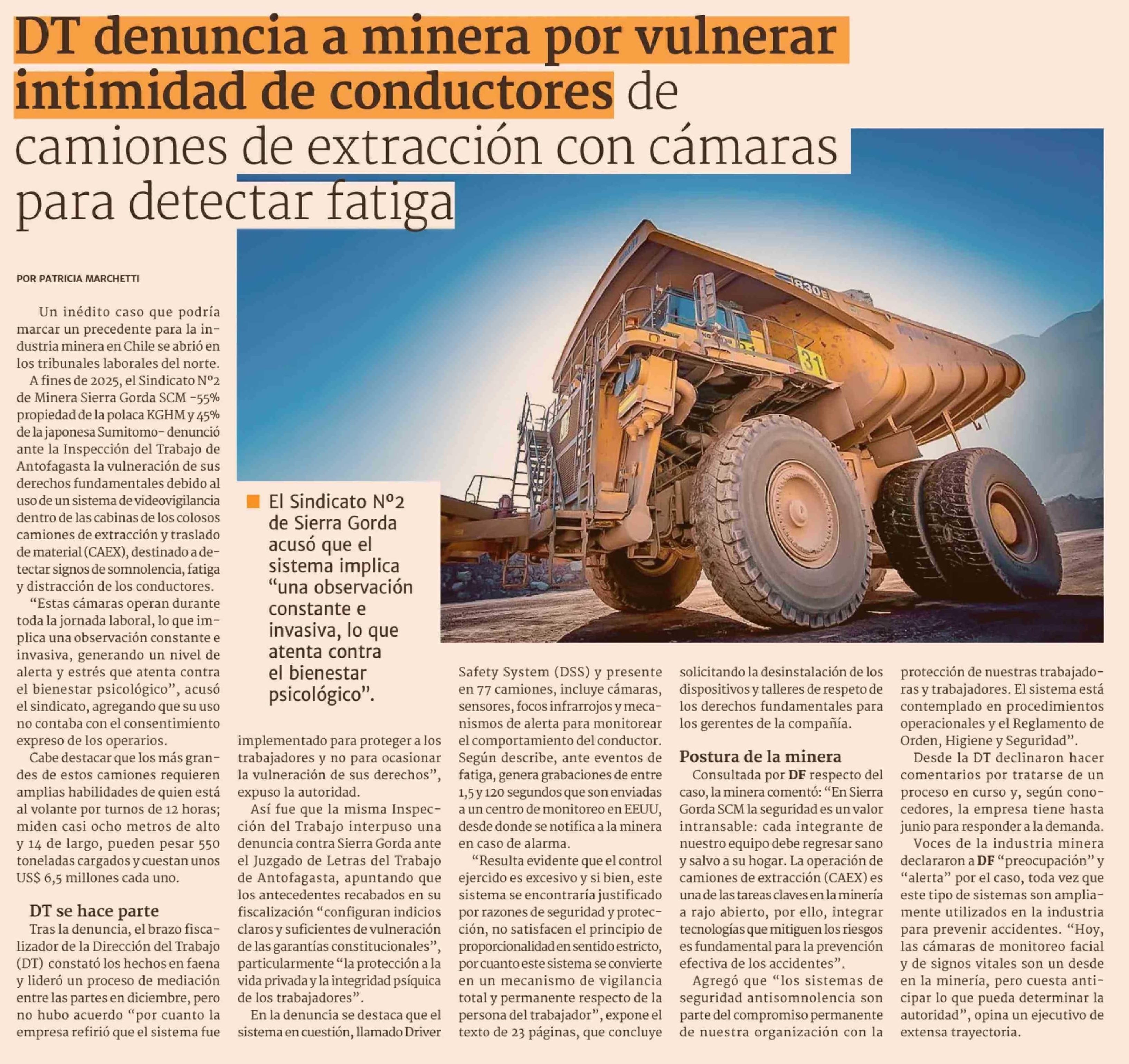 DT denuncia a minera por vulnerar intimidad de conductores de camiones de extracción con cámaras para detectar fatiga