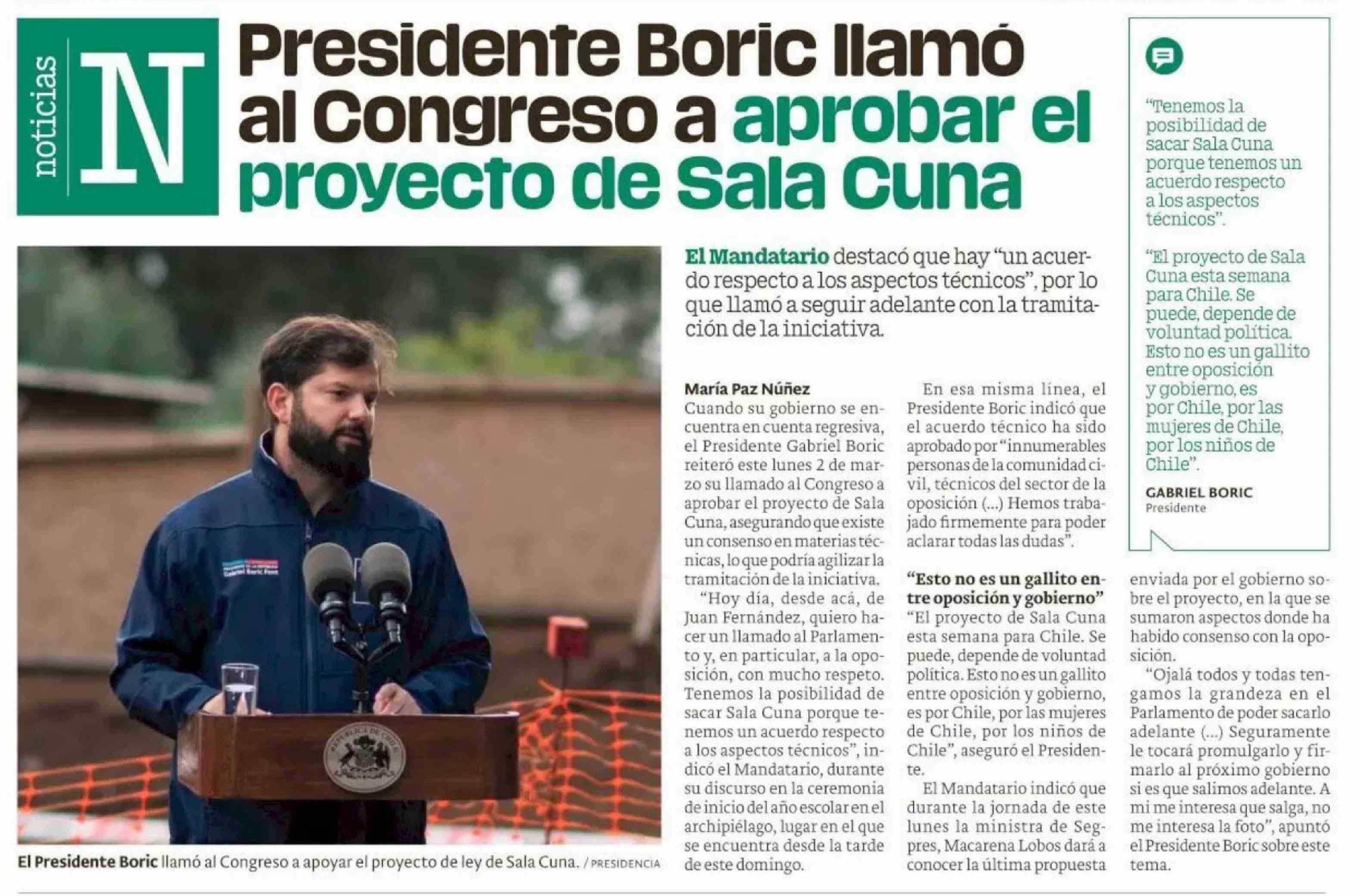 Presidente Boric llamo al Congreso a aprobar el N proyecto de Sala cuna