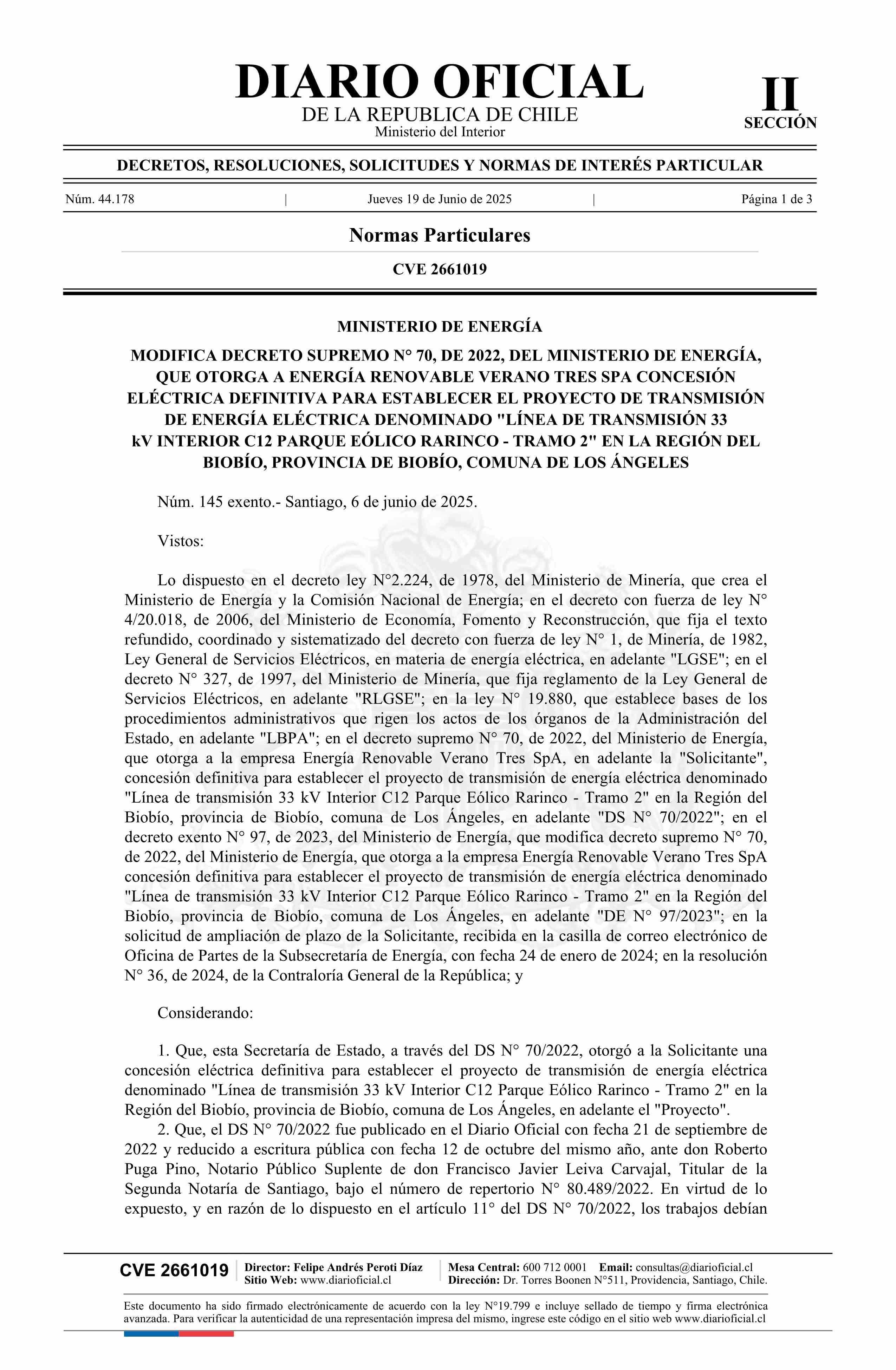 | Título: | Decreto exento número 145, de 2025.- Modifica decreto N° 70, de 2022, que otorga a Energía Renovable Verano Tres SpA concesión eléctrica definitiva para establecer el proyecto de transmisión de energía eléctrica denominado Línea de Transmisión 33 kV Interior C12 Parque Eólico Rarinco - Tramo 2, en l |