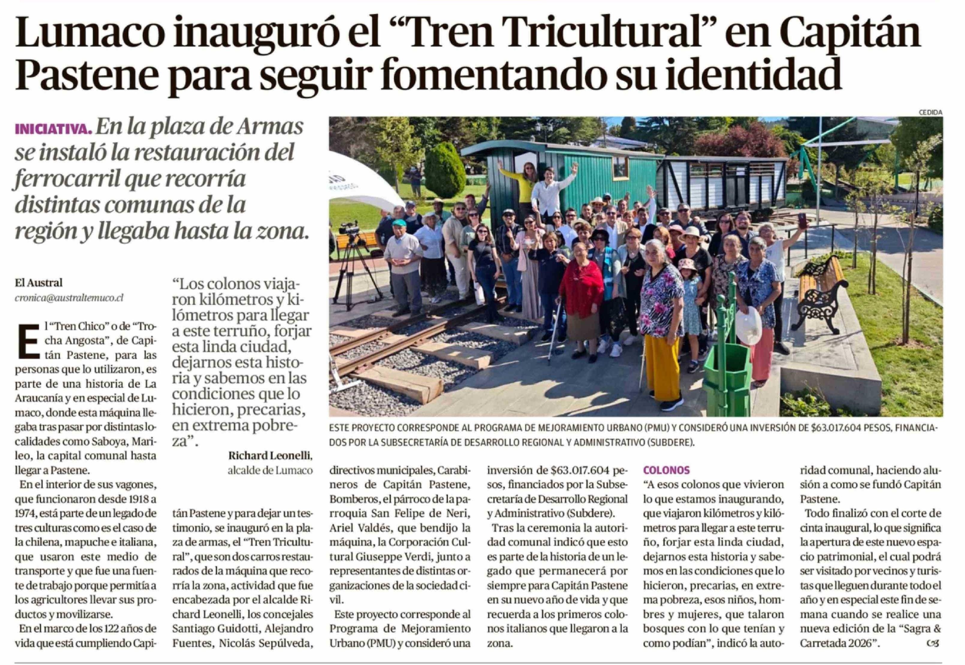Lumaco inauguró el "Tren Tricultural" en Capitán Pastene para seguir fomentando su identidad